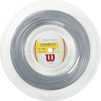 Wilson Poly Pro - poliestrowy naciąg tenisowy charakteryzujący się dużą wytrzymałością i dobrą kontrolą. Propozycja dla mocno grających tenisistów. Poliestrowy rdzeń otoczony specjalną powłoką ochronną dla zwiększenia trwałości poprzez zredukowanie tarcia. Świetnie sprawdzi się w łączeniach hybrydowych zwłaszcza z miękkimi naciągami syntetycznymi. Kolor: srebrny, Grubość: 1,25; 1,30 mm, Długość: 200 m.