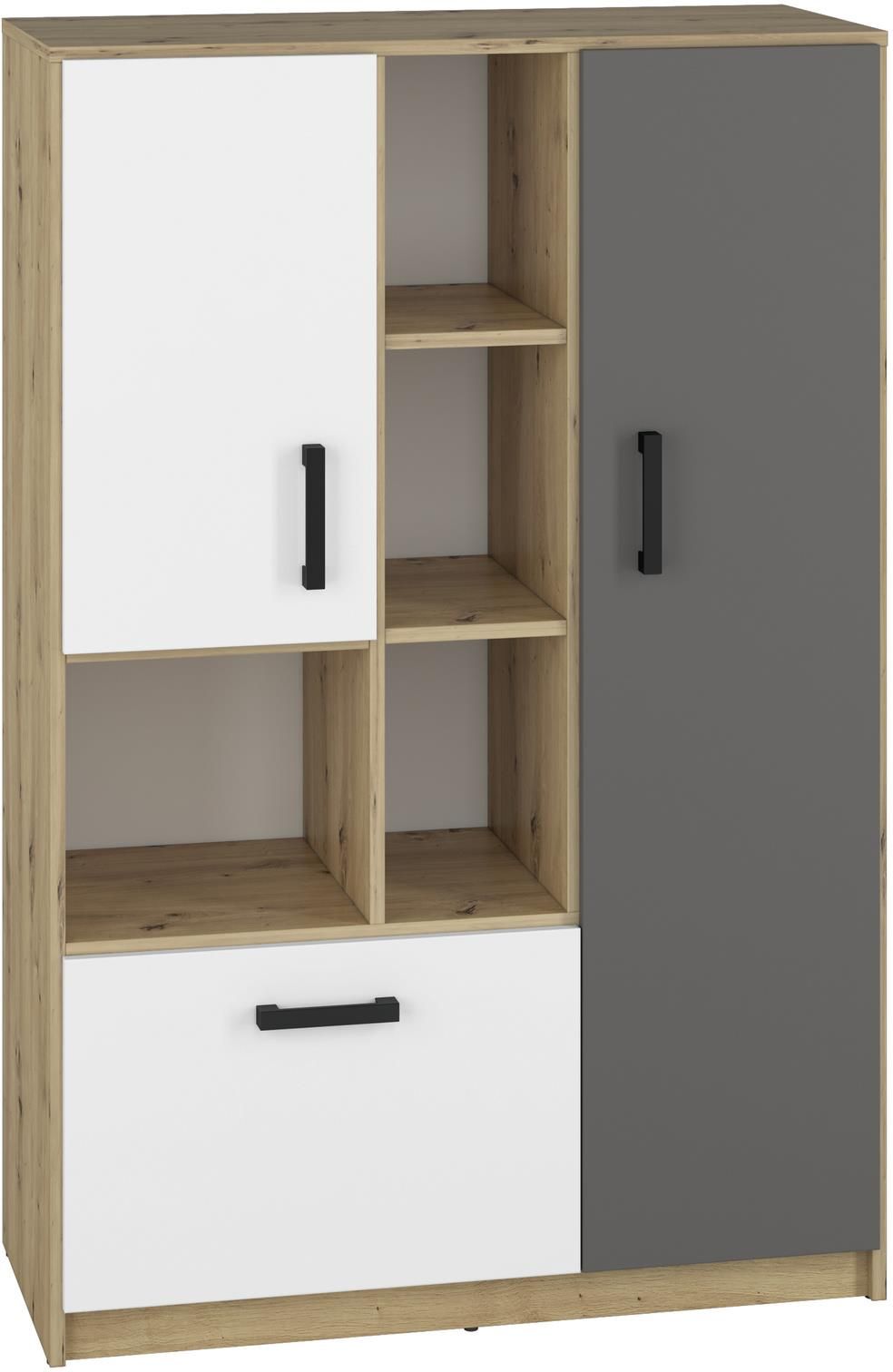 Nasze meble z kolekcji FINI wyróżnia nie tylko jakość wykonania, doskonały i ponadczasowy design, ale także każdy element dopracowany w najmniejszym szczególe. Regał Fini 05 to nowoczesny, bezpretensjonalny styl ukryty w prostocie dekorów i mocno zaznaczonym, charakterystycznym, naturalnym rysunku drewna. Mebel posiada 4 otwarte półki, 5 zamkniętych oraz pojemną szufladę.Dyskretne stopki ślizgowe ułatwiają przesuwanie mebla bez zarysowania podłogi. Regał, dzięki swojej prostej konstrukcji, nie tylko podkreśli estetykę pokoju nastolatka, ale także umożliwi utrzymanie porządku, z łatwością mieszcząc ubrania, książki, podręczniki, czy liczne akcesoria hobbystyczne każdego nastolatka. Kolekcja Fini to oryginalne i proste w formie bryły w modnych dekorach.Nowoczesna i zdecydowana kombinacja kolorów - białego alpejskiego i antracytowego z klasycznie usłojonym dębem artisan - odzwierciedla dynamiczny temperament nastolatków. Geometria frontów i korpusów tworzy efekt porządku, spójności oraz młodzieżowej elegancji. Kontrastujące czarne uchwyty podkreślają nieprzeciętność mebli Fini.