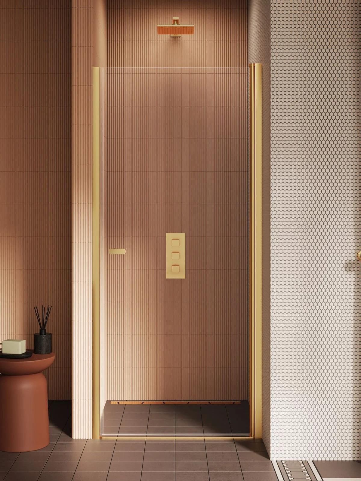 Drzwi wnękowe 90 kolor Złota szczotkowanego New Soleo Gold Brushed UNIWERSALNE: Montaż możliwy jako lewe lub prawe Renomowanej firmy NEW TRENDY Model New Soleo Gold Brushed posiada eleganckie, złote detale o szczotkowanym wykończeniu. Drzwi prysznicowe wyposażone w bezpieczną, hartowaną szybę o grubości 6mm, z powłoką ochronną Active Shield 2.0. Posiadają zawias kolumnowy, pozwalający uchylać drzwi na zewnątrz i do środka. Produkt może być instalowany z brodzikiem lub bez brodzika. DANE TECHNICZNE DRZWI Drzwi prysznicowe uchylne Szerokość drzwi A: 89-91,5 cm (zakres regulacji), Szerokość wejścia W: 77,5 cm, Wysokość H: 195 cm, Szkło: hartowane 6 mm, czyste, Powłoka ochronna szkła ActiveShield, Regulacja przyścienna na profilu, Uszczelki magnetyczne, Funkcja unoszenia drzwi, Możliwość montażu bezpośrednio na podłodze z odpływem liniowym. Montaż drzwi uniwersalny jako lewe lub prawe STYLOWY I BEZPIECZNY UCHWYT Złote o szczotkowanym wykończeniu, zaokrąglone uchwyty znakomicie pasują do kształtu drzwi prysznicowych, dzięki czemu produkt doskonale prezentuje się w łazience o tradycyjnym jak i nowoczesnym wystroju. SUBTELNA FORMA Elegancki profil przyścienny zapewnia stabilność produktu. Forma detali sprawia, że łazienka prezentuje się ekskluzywnie i nowocześnie. ZAWIAS KOLUMNOWY Zawias, który ma formę kolumny, zapewnia szerokie i wygodne wejście. Posiada funkcję unoszenia, która zapobiega zużywaniu się uszczelki. Skrzydła drzwiowe otwierają się zarówno na zewnątrz, jak i do środka. Szkło przeźroczyste bezpieczne hartowane 6 mm Powłoka przeciwosadowa ActivShield ułatwiającą utrzymanie kabiny w czystości Powłoka Active Shield - w standardzie posiada ona właściwości hydrofobowe, dzięki czemu krople wody nie utrzymują się na powierzchni szkła, tylko spływają, nie pozostawiając osadów aby długo cieszyć się zaletami powłoki Active Shield wystarczy po każdej kąpieli spłukać szkło wodą zaleca się stosowanie środków do pielęgnacji kabin prysznicowych dostępnych w naszej ofercie Możliwy jest montaż bez listwy lub z listwą progową.