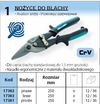 17381 Nożyce do blachy do cięcia na wprost, L1=40mm, L=250mm, Proline Proline 17381 Nożyce do blachy do cięcia na wprost, L1=40mm, L=250mm, Proline Specyfikacja: Przeznaczone dla wymagających użytkowników, do pracy serwisach blacharskich i budowlanych Nożyce do blachy wykonano z najlepszej jakości stali chromowo molibdenowej (Cr-M), parametrami przewyższają normę DIN 6438 a doskonale zahartowane ostrza posiadają twardość 56-62 HRC Do cięcia blachy standardowej i nierdzewnej do 1,5mm grubości Nożyce posiadają mechanizm podwójnej dźwigni, wzmacniający siłę nacisku, by zwiększyć komfort pracy Rękojeść nożyc o ergonomicznym kształcie gwarantuje komfort pracy, a ich specjalnie wyprofilowany kształt zabezpiecza dłonie i palce przed urazem
