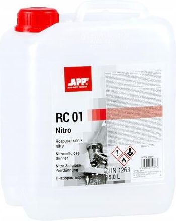 APP RC 01 Nitro to wysokiej jakości rozcieńczalnik nitro w opakowaniu 5 litrów, przeznaczony do ustalania lepkości natryskowej produktów nitrocelulozowych oraz do efektywnego czyszczenia narzędzi i pistoletów lakierniczych. Charakteryzuje się bardzo dobrymi właściwościami myjącymi i wysoką przejrzystością, co wpływa na komfort i precyzję pracy w lakiernictwie. Najważniejsze cechy - Rozcieńczalnik nitro do produktów nitrocelulozowych - Bardzo dobre właściwości myjące – skuteczne usuwanie lakierów i zabrudzeń - Typowy, nieduszący zapach ułatwiający pracę - Bezbarwna ciecz o idealnej przejrzystości - Przeznaczony do mycia pistoletów natryskowych i narzędzi lakierniczych - Stabilna jakość do profesjonalnych zastosowań Zastosowanie - Rozcieńczanie produktów nitrocelulozowych do lepkości natryskowej - Mycie pistoletów lakierniczych i narzędzi - Czyszczenie po pracach lakierniczych - Usuwanie świeżych pozostałości lakierów nitro Informacje techniczne - Producent: APP - Model: RC 01 Nitro - Pojemność: 5 L - Kolor: bezbarwny - Zastosowanie: rozcieńczanie, czyszczenie, mycie narzędzi - Zapach: typowy, nieduszący Zawartość zestawu - APP RC 01 Nitro – rozcieńczalnik 5 L Najczęściej zadawane pytania (FAQ) Do czego służy rozcieńczalnik APP RC 01? Do rozcieńczania produktów nitrocelulozowych oraz mycia narzędzi i pistoletów natryskowych. Czy nadaje się do czyszczenia sprzętu lakierniczego? Tak, posiada bardzo dobre właściwości myjące i skutecznie usuwa świeże pozostałości lakierów. Jaki ma zapach? Rozcieńczalnik ma typowy, nieduszący zapach ułatwiający pracę. APP RC 01 Nitro to profesjonalny rozcieńczalnik o wysokiej skuteczności, idealny do zastosowań lakierniczych i czyszczenia narzędzi.
