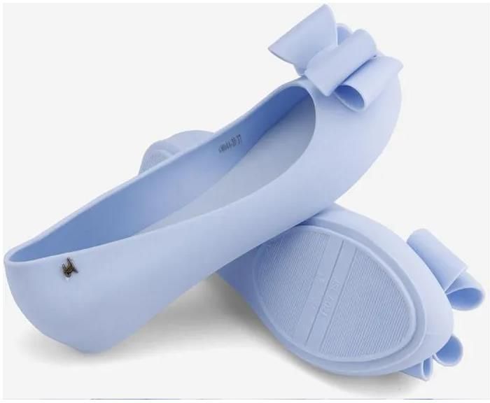 Balerinki damskie osadzone na płaskiej podeszwie z lekkim podwyższeniem. Wsuwane, wodoodporne, wykonane z materiału gumowego. Na przodzie duża ozdobna kokarda. Na plaże, na basen świetnie wpisują się w letni klimat.