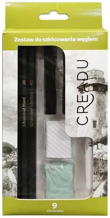 - zestaw do szkicowania - zawiera: 3 ołówki węglowe, 2 węgle, 1 gumkę, 1 gumkę miękką, 1 ołówek do cieniowania, 1 temperówkę - pakowane na blistrze