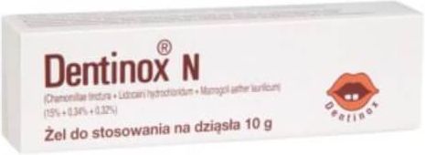 Produkt leczniczy tradycyjnie stosowany w wymienionych wskazaniach, którego skuteczność opiera się wyłącznie na długim okresie stosowania i doświadczeniu. Produkt leczniczy tradycyjnie stosowany w łagodzeniu dolegliwości związanych z bolesnym wyrzynaniem się zębów mlecznych (podrażnienia dziąseł i dolegliwości bólowe). W przypadku pojawienia się silniejszego zaczerwienienia lub obrzęku dziąseł oraz w razie wystąpienia reakcji nadwrażliwości na skórze lub błonach śluzowych należy skontaktować się z lekarzem. To samo odnosi się do wystąpienia wtórnych dolegliwości towarzyszących. Produkt leczniczy tradycyjnie stosowany w wymienionych wskazaniach, którego skuteczność opiera się wyłącznie na długim okresie stosowania i doświadczeniu.Produkt leczniczy tradycyjnie stosowany w łagodzeniu dolegliwości związanych z bolesnym wyrzynaniem się zębów mlecznych (podrażnienia dziąseł i dolegliwości bólowe).W przypadku pojawienia się silniejszego zaczerwienienia lub obrzęku dziąseł oraz w razie wystąpienia reakcji nadwrażliwości na skórze lub błonach śluzowych należy skontaktować się z lekarzem. To samo odnosi się do wystąpienia wtórnych dolegliwości towarzyszących. Skład i dawkowanie Dentinox N Skład jakościowy i ilościowy 10g żelu zawiera: Chamomillae tinctura (nalewka z rumianku) (1:4-4,5) 1500 mg Ekstrahent etanol 70% (V/V) Lidocaini hydrochloridum (lidokainy chlorowodorek) 34mg Macrogoli aether laurilicum (makrogolu eter laurylowy) 32 mg Zawartość etanolu w produkcie max 9,5% Substancje pomocnicze o znanym działaniu: glikol propylenowy 1500 mg, sorbitol ciekły niekrystalizujący 1000 mg. Dawkowanie Stosować krótkotrwale w przypadku pojawienia się ostrych objawów ząbkowania. Produkt leczniczy Dentinox N nie powinien być stosowany u niemowląt poniżej 3 miesiąca życia. Produkt leczniczy Dentinox N nie powinien być stosowany również u niemowląt poniżej 12 miesiąca życia, jednocześnie leczonych środkami wywołującymi methemoglobinemię. Sposób podawania Podanie na dziąsła. Smarować dziąsła niewielką ilością żelu (wielkości ziarnka grochu) przy pomocy czystego palca lub bawełnianego patyczka i lekko wmasować. Ta czynność powinna być powtarzana 2-3 razy dziennie, zwłaszcza po jedzeniu lub po wykonaniu zabiegów higienicznych w jamie ustnej przed pójściem spać. Jeśli po upływie 7 dni nie nastąpiła poprawa lub pacjent poczuje się gorzej, należy zwrócić się do lekarza. Przeciwwskazania Nadwrażliwość na substancje czynne lub na którąkolwiek substancję pomocniczą. Nietolerancja rumianku lub innych roślin z rodziny Asteraceae, lidokainy lub podobnych środków miejscowo znieczulających (typu amidowego). Reakcje nadwrażliwości na rumianek (np. kontaktowe zapalenie skóry) są bardzo rzadkie. Reakcja krzyżowa może wystąpić u ludzi uczulonych na rośliny z rodziny Asteraceae (np. bylica). Ze względu na zawartość sorbitolu, lek nie powinien być używany przez pacjentów cierpiących na rzadką wrodzoną nietolerancję fruktozy. Produkt leczniczy Dentinox N nie powinien być stosowany u niemowląt poniżej 3 miesiąca życia. Produkt leczniczy Dentinox N nie powinien być stosowany również u niemowląt poniżej 12 miesiąca życia, jednocześnie leczonych środkami wywołującymi methemoglobinemię. PKWIU 21.20.13.0 Rodzaj EAN 5909997205144 BLOZ_07 4645611