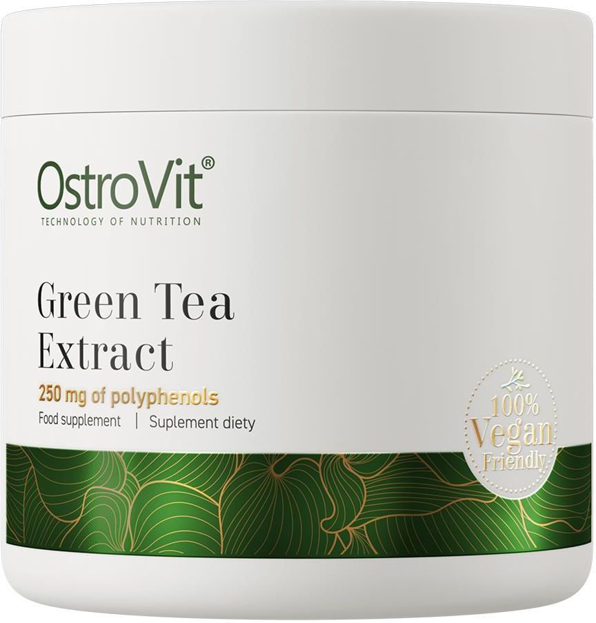 OstroVit Zielona Herbata Extract 100g GREEN TEA OstroVit Zielona Herbata Extract 100 g OstroVit Zielona Herbata Extract to naturalny suplementy diety w formie proszku wytwarzanego z liści zielonej herbaty. Preparat charakteryzuje się wysoką zawartością polifenoli, które odgrywają bardzo ważną rolę w organizmie. Zielona herbata delikatnie pobudza organizm do działania, wspiera spalanie tkanki tłuszczowej oraz proces trawienia, stymuluje mózg, a także oczyszcza. Jeżeli jesteś na diecie redukcyjnej i poszukujesz suplementu, który wesprze Cię w walce o piękną figurę, koniecznie wypróbuj ekstrakt z zielonej herbaty marki OstroVit. W jaki sposób działa ekstrakt z zielonej herbaty? OstroVit Zielona Herbata Extract to bogate źródło cennych substancji odżywczych, w tym kofeiny, L-teaniny oraz polifenoli. Dzięki wysokiej zawartości przeciwutleniaczy środek hamuje rozwój wolnych rodników, dzięki czemu naturalnie oczyszcza organizm. Wykazuje również właściwości bakteriobójcze, a także chroni skórę przed szkodliwym promieniowaniem UV. Dodatkowo pozwala utrzymać odpowiedni poziom cholesterolu i cukru we krwi. Ekstrakt z zielonej herbaty polecany jest wszystkim osobom, które chcą w bezpieczny sposób zrzucić nadmiarowe kilogramy i tym samym zmniejszyć ilość tkanki tłuszczowej w organizmie. Zawarte w suplemencie polifenole pobudzają rozpad tłuszczu, a także proces niszczenia komórek tłuszczowych. Z kolei kofeina hamuje odczucie głodu. Postaw na suplement OstroVit Zielona Herbata Extract, jeżeli: chcesz zgubić zbędne kilogramy jesteś na diecie redukcyjnej poszukujesz naturalnego antyoksydantu zmagasz się z wysokim cholesterolem Właściwości suplementu diety OstroVit Zielona Herbata Extract Suplement OstroVit Zielona Herbata Extract charakteryzuje się wysoką zawartością drogocennych polifenoli, które wykazują silne działanie antyoksydacyjne – oczyszczają organizm od środka, chroniąc go przed szkodliwym promieniowaniem UV, a także zapobiegają infekcjom. Ich regularne spożywanie może wesprzeć proces trawienia i prowadzić do redukcji tkanki tłuszczowej. Najważniejsze cechy suplementu diety: WSPARCIE ODCHUDZANIA - Ekstrakt z zielonej herbaty ułatwi Ci zrzucenie nadmiarowych kilogramów. Dzięki regularnemu spożyciu suplementu możesz w łatwy sposób zredukować ilość komórek tłuszczowych, dzięki czemu łatwiej osiągniesz wymarzoną sylwetkę. DZIAŁANIE ANTYOKSYDACYJNE - Dzięki zielonej herbacie możesz w łatwy sposób oczyścić swój organizm od środka. Polifenole pozwolą Ci zredukować wolne rodniki oraz ochronić organizm przed stresem oksydacyjnym. ROŚLINNY SKŁAD - Ekstrakt z zielonej herbaty to naturalny sposób na piękny wygląd i zdrowie. Suplement diety to preparat jednoskładnikowy – w jego składzie nie znajdziesz żadnych wypełniaczy i innych substancji, które mogą hamować działanie ekstraktu. ŁATWE DAWKOWANIE - Nowoczesna forma ekstraktu roślinnego o dużej koncentracji składników aktywnych sprawdzi się idealnie, jeżeli nie przepadasz za suplementami w formie tabletek i kapsułek. Spożywać 1 porcję - 500 mg (1 miarka) dziennie z posiłkiem, popijając wodą. Proszę użyć miarki dołączonej do opakowania (1 ml). Nie przekraczać zalecanej dziennej porcji do spożycia. Suplement diety nie może być stosowany jako substytut (zamiennik) zróżnicowanej diety. Zalecany jest zrównoważony sposób żywienia i zdrowy tryb życia. Nie spożywać w przypadku uczulenia na którykolwiek ze składników produktu. Produkt nie powinien być stosowany przez dzieci, kobiety w ciąży i matki karmiące. Przechowywać w sposób niedostępny dla małych dzieci. Składniki Ekstrakt z liści zielonej herbaty (Camellia sinensis L.) standaryzowany na 50% polifenoli. Produkt może zawierać mleko (łącznie z laktozą), soję, orzeszki ziemne, inne orzechy, nasiona sezamu, zboża zawierające gluten, jaja, skorupiaki, ryby. Wartość odżywcza Masa netto produktu: 100 g Ilość porcji w opakowaniu: 200 Wielkość porcji: 500 mg Składniki aktywne Na porcję Ekstrakt z liści zielonej herbaty, w tym: 500 mg - polifenole (50%) 250 mg