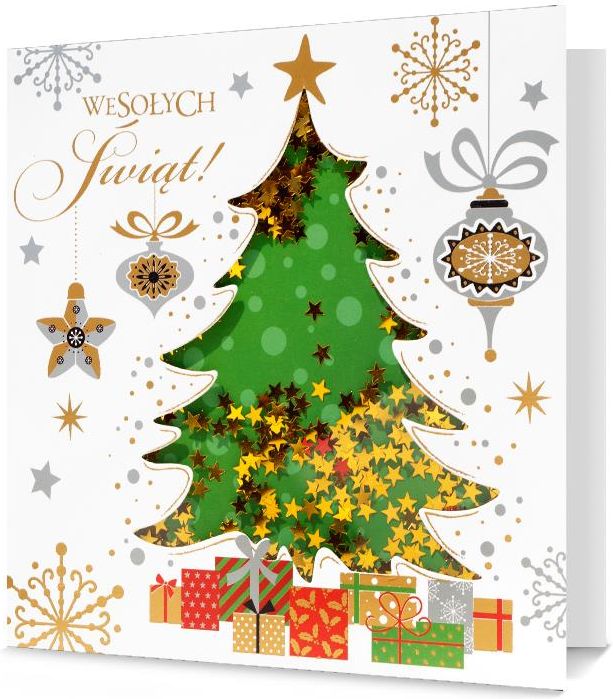 Kartka Świąteczna na Boże Narodzenie - Wesołych Świąt ✅ Kartka Świąteczna - Wesołych Świąt Format: 15 cm x 15 cm. Kod produktu: HM100-774. W zestawie karnet i koperta. ✅ Kartka świąteczna na Boże Narodzenie Oferowana kartka Bożonarodzeniowa jest bardzo efektowna i ciekawie zaprojektowana. Wykonano ją z wysokiej jakości papieru z świątecznym motywem choinki, w środku której przesypuje się złote konfetti. ✅ Tekst życzeń w środku Bożonarodzeniowej kartki: Lśni dookoła choinkowy blask, śniegu napadało, niebo pełne gwiazd. Niech ten czas radością wypełni Wasz dom! Wesołych świąt!