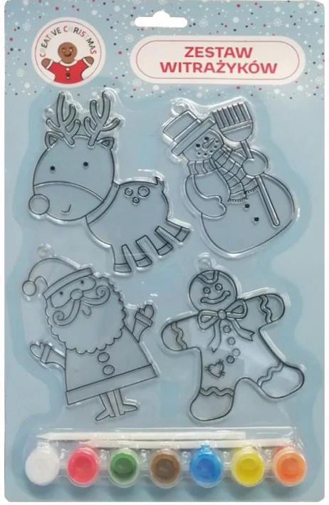 - zestaw witrażyków - zawiera: 4 witraże, 7 farbek w kolorach: biały, różowy, zielony, brązowy, niebieski, żółty i pomarańczowy, 2 plastikowe patyczki do nakładania farby - produkt pakowany na blistrze - wymiary w opakowaniu: 31,5 x 20,9 x 2 cm