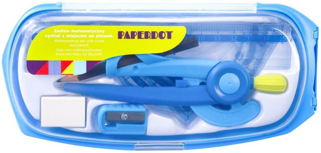 Paperdot, Zestaw Matematyczny, Niebieski, 7 Sztuk w zestawie znajduje się: - linijka - kątomierz - 2x ekierki - cyrkiel - gumka do ścierania - temperówka linijka ze skalą: w centymetrach długość linijki: 15 cm kolor: niebieski