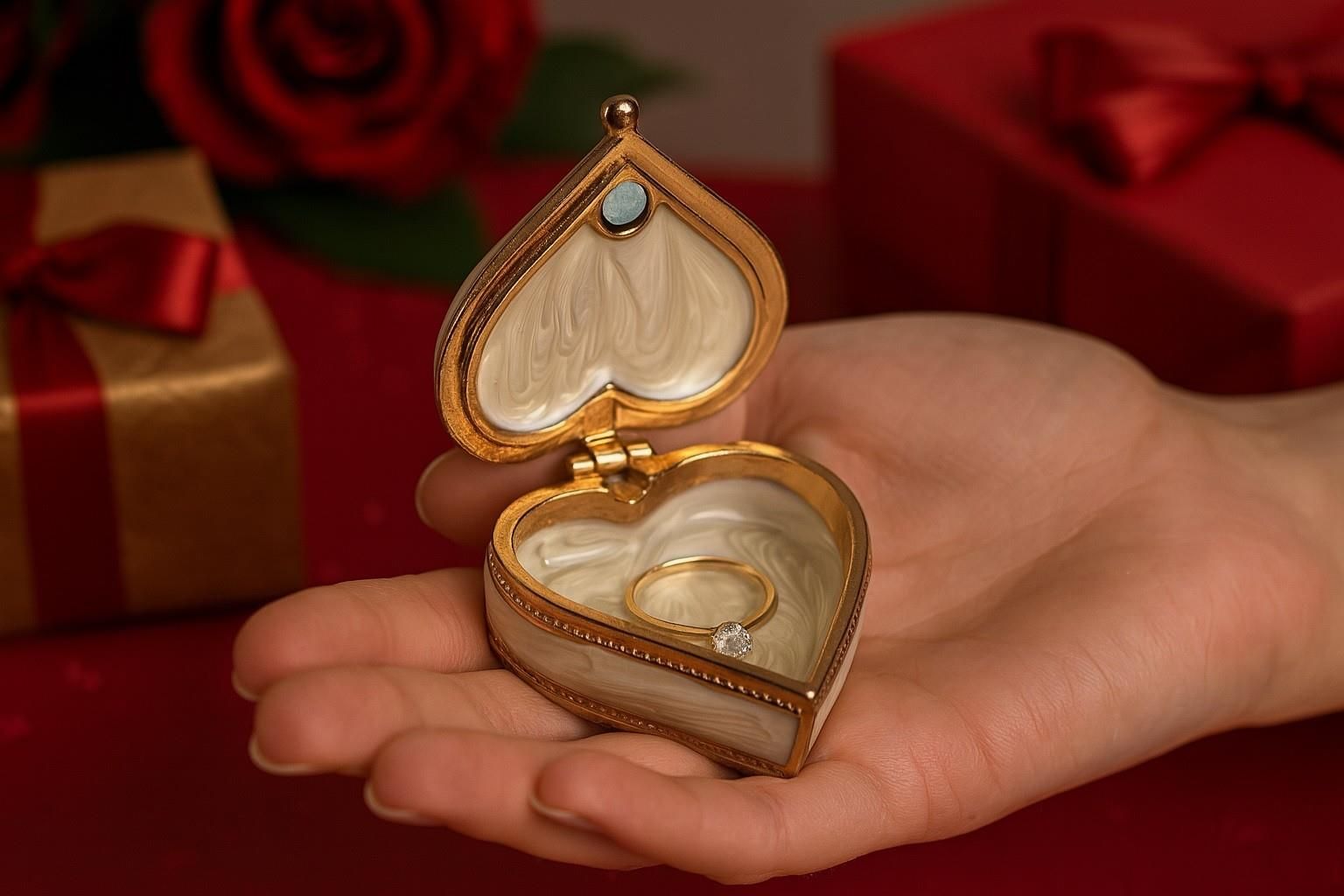 Perłowo-białe puzderko w kształcie serca – romantyczna elegancja To serduszkowe puzderko emanuje subtelnym urokiem – wykończone perłową masą plastyczną w stylu marmuru i złotymi zdobieniami. Na wieczku widnieje misterny motyw koronkowy z centralną perłą i cyrkoniami. Wnętrze z efektem „wylewanego mleka” nadaje całości luksusowy charakter. Zastosowanie: Pojemnik na zaręczynowy pierścionek lub biżuterię na wyjątkowe okazje. Uroczy prezent na walentynki, rocznicę lub ślub. Dekoracja do toaletki lub łazienki w stylu glamour lub shabby chic. „Puzderko” pochodzi od niem. Büchse przez pudło , a oznacza niewielkie pudełeczko lub szkatułkę służącą do przechowywania drobnych, często cennych przedmiotów – głównie biżuterii. To wyraz historyczny, ale nadal popularny w kontekście stylowych, kobiecych dodatków i drobnych pamiątek. Zdjęcie tytułowe ma charakter poglądowy. Prezentowana aranżacja może zawierać elementy dekoracyjne niewchodzące w skład zestawu. Szczegóły dotyczące zawartości znajdują się w opisie produktu. Cena dotyczy 1 szt.
