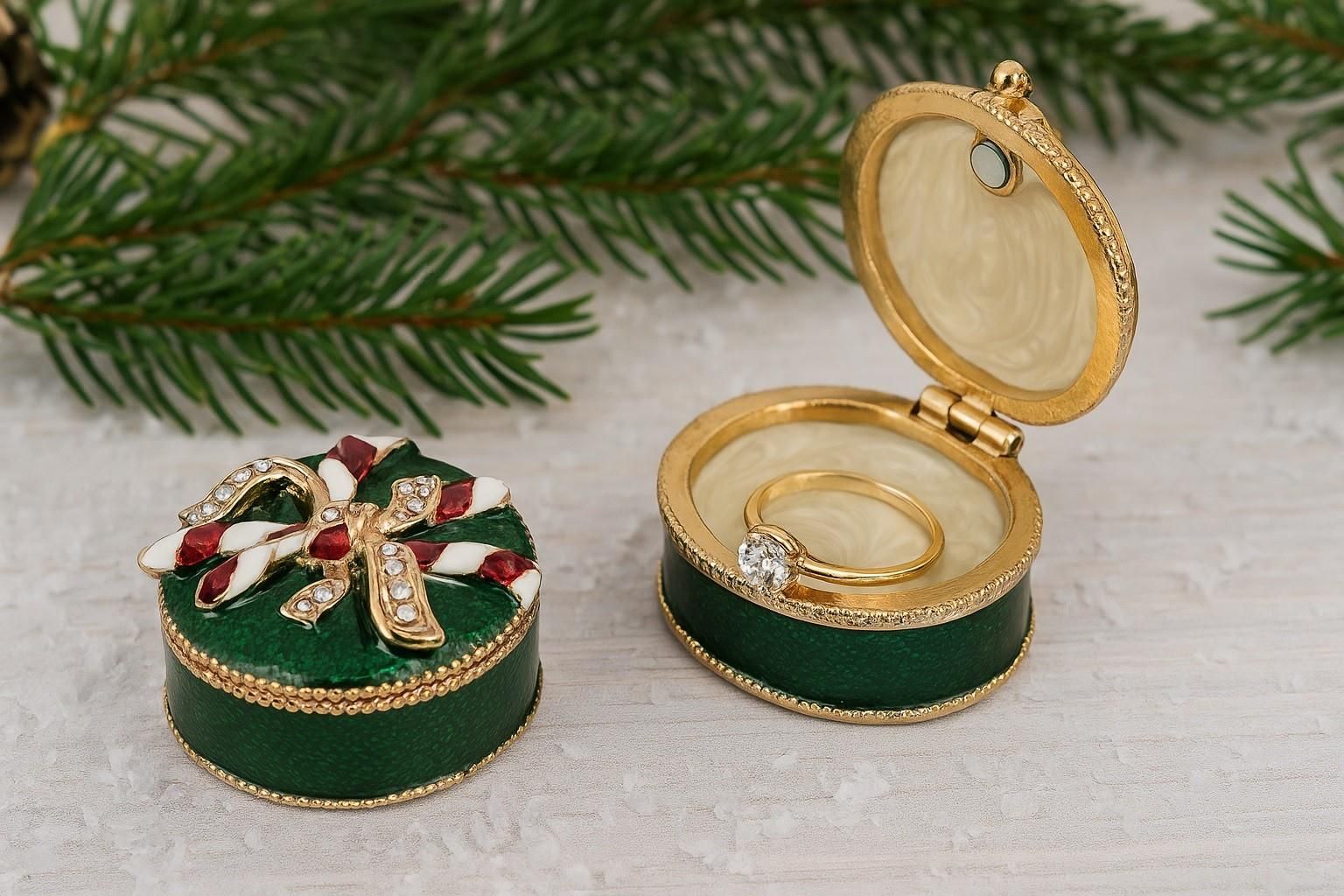 Zielone puzderko z laskami cukrowymi – klasyka świątecznych tradycji Zielone puzderko w kształcie okrągłym zdobione jest złotą kokardą oraz skrzyżowanymi laskami cukrowymi z białym i czerwonym szkliwem. Boki pokryte są metaliczną masą w stylu emalii, wykończone finezyjną ramką. Model zachwyca jakością wykonania i świątecznym wdziękiem. Zastosowanie: Doskonały pomysł na upominek dla miłośników Bożego Narodzenia. Elegancka skrytka na obrączkę, łańcuszek lub charms. Może pełnić funkcję ozdoby na półce lub komodzie w okresie zimowym. „Puzderko” pochodzi od niem. Büchse przez pudło , a oznacza niewielkie pudełeczko lub szkatułkę służącą do przechowywania drobnych, często cennych przedmiotów – głównie biżuterii. To wyraz historyczny, ale nadal popularny w kontekście stylowych, kobiecych dodatków i drobnych pamiątek. Zdjęcie tytułowe ma charakter poglądowy. Prezentowana aranżacja może zawierać elementy dekoracyjne niewchodzące w skład zestawu. Szczegóły dotyczące zawartości znajdują się w opisie produktu. Cena dotyczy 1 szt.