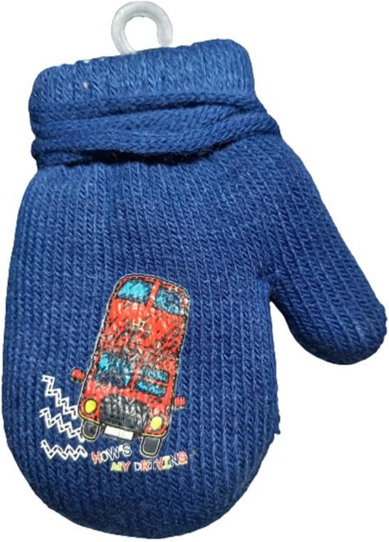 Dzianinowe rękawiczki chłopięce w kolorze granatowym. Wykonane z akrylu. Wewnątrz ocieplone grubą i mięciutką frotką. Na wierzchu ozdobione aplikacją z piętrowym autobusem. Rękawiczki są ze sobą połączone sznurkiem dzięki temu trudniej je zgubić. Niezbędny na zimowe spacery Produkt wysokiej jakości, wykonany w Polsce.