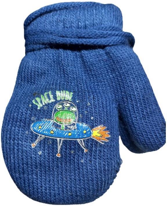 Dzianinowe rękawiczki chłopięce w kolorze granatowym. Wykonane z akrylu. Wewnątrz ocieplone grubą i mięciutką frotką. Na wierzchu ozdobione aplikacją ze statkiem kosmicznym. Rękawiczki są ze sobą połączone sznurkiem dzięki temu trudniej je zgubić. Niezbędny na zimowe spacery Produkt wysokiej jakości, wykonany w Polsce.