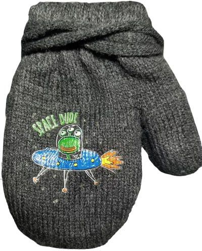 Dzianinowe rękawiczki chłopięce w kolorze szarym ciemnym. Wykonane z akrylu. Wewnątrz ocieplone grubą i mięciutką frotką. Na wierzchu ozdobione aplikacją ze statkiem kosmicznym. Rękawiczki są ze sobą połączone sznurkiem dzięki temu trudniej je zgubić. Niezbędny na zimowe spacery Produkt wysokiej jakości, wykonany w Polsce.