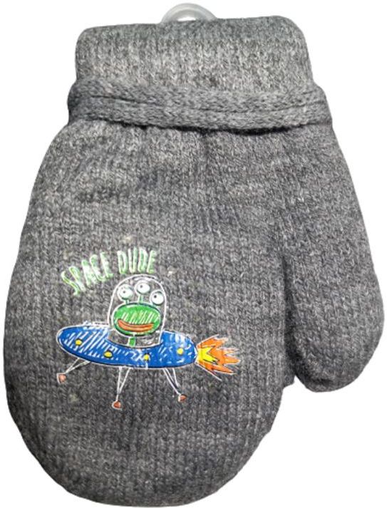 Dzianinowe rękawiczki chłopięce w kolorze szarym jasnym. Wykonane z akrylu. Wewnątrz ocieplone grubą i mięciutką frotką. Na wierzchu ozdobione aplikacją ze statkiem kosmicznym. Rękawiczki są ze sobą połączone sznurkiem dzięki temu trudniej je zgubić. Niezbędny na zimowe spacery Produkt wysokiej jakości, wykonany w Polsce.