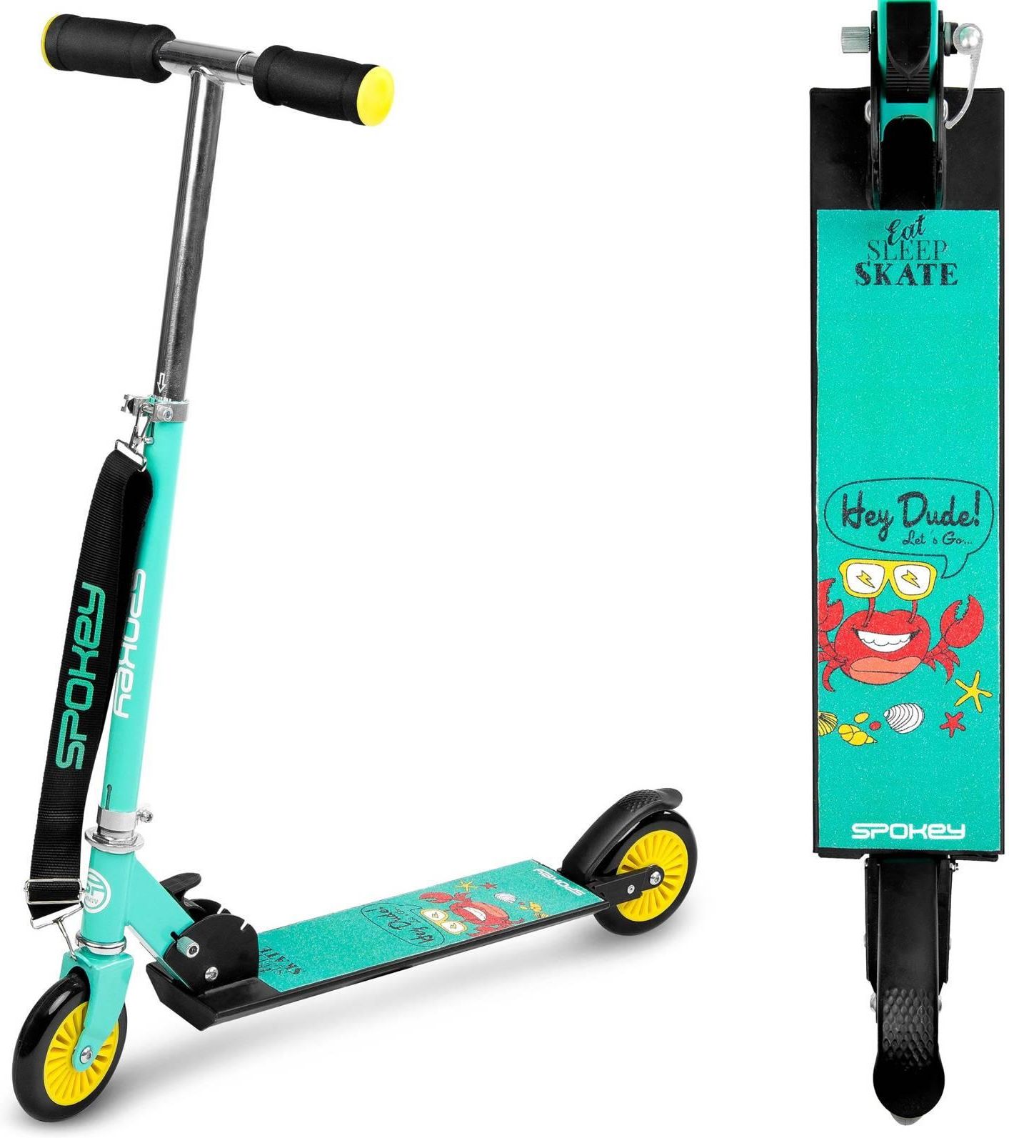 Hulajnoga dziecięca Spokey SNAPP: - została stworzona z myślą o najmłodszych, dlatego zapewnia najwyższy poziom bezpieczeństwa podczas jazdy, - została wyposażona w hamulec nożny, który pozwala na dostosowanie prędkości jazdy do panujących warunków, - posiada taśmę, która ułatwia przenoszenie hulajnogi, gdy akurat się na niej nie poruszamy. SNAPP to hulajnoga zaprojektowana dla najmłodszych, dlatego została stworzona z myślą o szybkich przejazdach pełnych radości, z zachowaniem kompleksowego bezpieczeństwa! Wyjątkowy design, piękne kolory i nowoczesne rozwiązania sprawiają, że nie można się z nią rozstać. Aktywność zawsze pod ręką Hulajnoga Spokey SNAPP została wyposażona w średniej wielkości koła (120 mm) oraz klasy łożyska (ABEC5), które wpływają na wyjątkową płynność jazdy oraz maksymalny komfort podczas skręcania. Posiada nożny hamulec, pozwalający na dostosowanie prędkości jazdy do panujących warunków. Aby jazda była zawsze przyjemna i bezpieczna, jej deck został pokryty antypoślizgową wykładziną w postaci oryginalnej grafiki! Możesz ją mieć zawsze ze sobą! SNAPP to idealny wybór dla dzieci i młodzieży także ze względu na łatwość transportowania! Hulajnoga posiada specjalny pasek, który pozwala na komfortowe przenoszenie małego pojazdu w czasie spacerów lub krótkich przejażdżek. Jest składana, bardzo kompaktowa, nie zajmuje dużo miejsca, dzięki czemu bez problemu zmieści się w bagażniku, windzie czy autobusie. Bezpieczeństwo i komfort jazdy Jeszcze więcej radości z bezpiecznych przejażdżek? To możliwe! SNAPP to hulajnoga dziecięca, która posiada mnóstwo udogodnień! Została wykonana ze stali, dzięki czemu jest odporna na uszkodzenia mechaniczne. Ważnym elementem jest regulowana kolumna kierownicy, która umożliwia dostosowanie wysokości do wzrostu użytkownika. Duży, antypoślizgowy podest zapewnia komfort użytkowania, a możliwość składania to przede wszystkim wygodny transport i łatwe przechowywanie hulajnogi. Dane techniczne: - materiał decku i ramy: stal - materiał kierownicy: stal - materiał rączek: pianka - materiał kółek: PU - materiał hamulca: stal - podest: antypoślizgowy - łożyska ABEC-5 Carbon - regulowana wysokość kierownicy od podestu: 64 - 69 - 74 cm - regulowana wysokość kierownicy od podłogi: 72 - 77 - 82 cm - wymiary decku: 39,5 x 9,5 cm - wymiary użytkowe decku: 33 x 9,5 cm - szerokość kierownicy: 29 cm - długość rączki: 9,5 cm - składana: tak - hamulec: nożny - waga hulajnogi: 2,6 kg - maksymalna waga użytkownika: 50 kg - zgodność z normą: EN14619