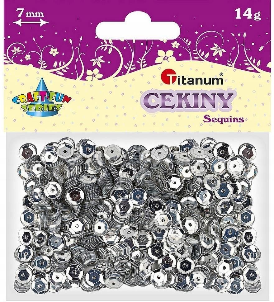 Cekiny 7mm metaliczne srebrne TITANUM __________________________________________________________________ Cekiny okrągłe. Kolor: metaliczny srebrny, średnica: 7 mm. Opakowanie: 14 g. EAN: 5907437649510 Opakowanie: blister Producent: Titanum …