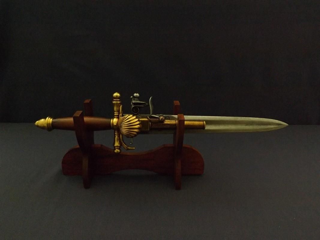 REPLIKA FRANCUSKIEGO PISTOLETU-SZTYLET NA STOJAKU DENIX MODEL 1204+801 DANE TECHNICZNE: Prezentujemy unikatową hybrydę NA STOJAKU. Francuski pistolet - sztylet z XVIII wieku. Przepiękna kombinacja pistoletu ze sztyletem, zdolny do oddania jednego strzału a następnie walki wręcz. Zaliczany do broni …