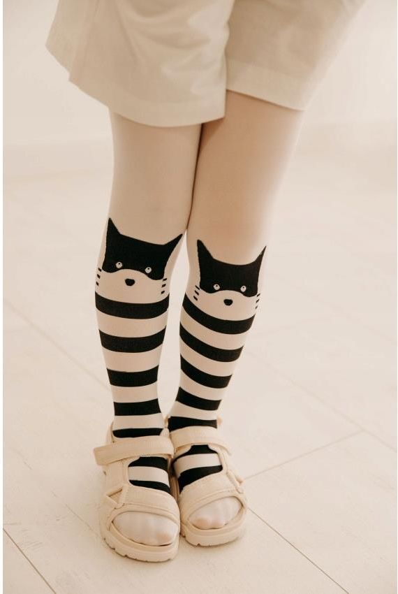 Stylowe rajstopy dziewczęce, ozdobione wyrazistym wzorem kocich pyszczków na kolanach z szerokimi, czarno-białymi pasami poniżej. Pół-kryjące, matowe, wykonane z wysokiej jakości przędz, które zostały wyselekcjonowane ze względu na elastyczność, idealne dopasowanie i trwałość. Rajstopy z zaznaczoną częścią majteczkową, niewidocznie wzmocnione palce. Zapewniają idealną równowagę między wygodą a stylem. Grubość: 40 DEN. Skład: 80% poliamid, 20% elastan.