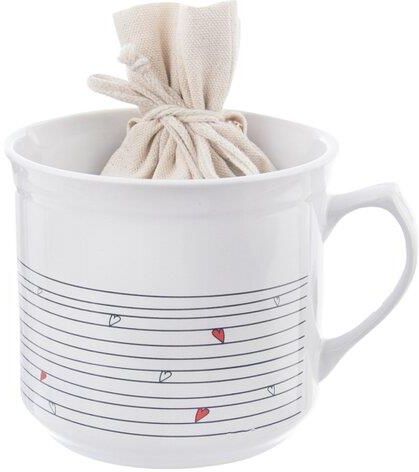 Kubek z woreczkiem ceramiczny biały SERCE 700 ml Duży kubek do picia napojów w zestawie z woreczkiem na herbatę lub zioła. Płaskie dno sprawia, że kubek można podgrzewać na piecu lub kuchence elektrycznej. Wykonany z ceramiki. Kod artykułu: 128852 Materiał: ceramika długość: 14,5 cm szerokość: 11,5 cm Wysokość: 10 cm Średnica: 11,5 cm pojemność: 700 ml Kolor dominujący: biały PRAKTYCZNY - Duży kubek o pojemności 700 ml do picia oraz podgrzewania napojów w zestawie z bawełnianym woreczkiem, w którym możemy umieścić sypaną herbatę lub zioła. Kubek ma wymiary 14,5 x 11,5 x 10 cm. Idealny do picia herbaty, kawy, kakao, mleka, ziół, wina grzanego oraz innych napojów. CERAMICZNY - Kubek wykonany z najwyższej jakości ceramiki w kolorze białym z pięknym dekorem w serca. Odpowiednio użytkowany posłuży długie lata. W zestawie bawełniany woreczek w beżowym kolorze z motywem serca. Woreczek ściągany jest za pomocą sznurka. WYGODNY UCHWYT - Kubek wyposażony w wygodny uchwyt, świetnie sprawdzi się do picia kawy lub herbaty. Uchwyt pewnie leży w dłoni. PŁASKIE DNO - Posiada płaskie dno, które sprawia, że kubek można wykorzystać jako garnuszek do podgrzewania napojów na piecu lub kuchence elektrycznej. ŁATWE UŻYTKOWANIE - Nadaje się do mycia w zmywarce do naczyń. Można podgrzewać w nim napoje w mikrofalówce. Woreczek można prać w temperaturze nie przekraczającej 30°C. Duży kubek idealny dla osób lubiących pić większe ilości napojów. Solidnie wykonany z najwyższej jakości materiałów. W zestawie woreczek, który pozwoli na wygodne przechowywanie ulubionej herbaty lub ziół. Niezwykle uniwersalny, posiada klasyczny design. Kubek ma płaskie dno, więc posłuży jako garnuszek do podgrzewania napojów. Łatwy w czyszczeniu i użytkowaniu. Kubek jest zawsze świetnym pomysłem na prezent. W naszej ofercie znajdują się również inne elementy z serii Serduszka. Oryginalny produkt czeskiej marki Orion. Wyprodukowano zgodnie z europejskimi standardami.