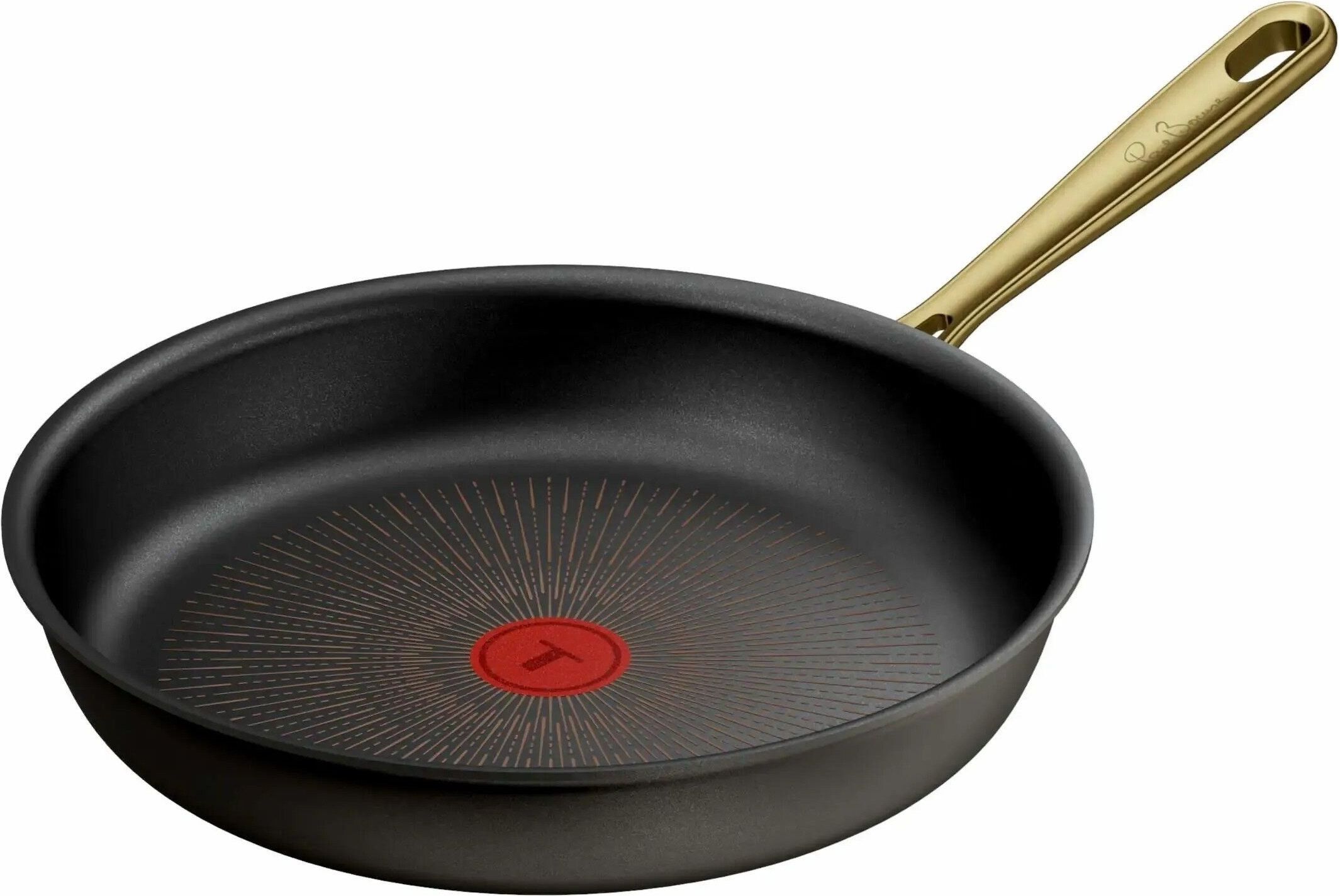 Patelnia TEFAL Paul Bocuse, łączy wysokiej jakości aluminium z trwałą powłoką nieprzywierającą, technologią Thermo-Spot™ i elegancką złotą rączką, zapewniając precyzję i wygodę przy codziennym gotowaniu. Produkt z linii La Collection Paul Bocuse wyróżnia się ponadczasowym designem, wysoką trwałością, kompatybilnością ze wszystkimi rodzajami kuchenek i możliwością użycia w piekarniku.
