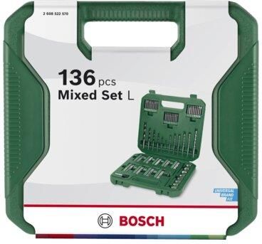 Zestaw mieszany L marki Bosch, do wiercenia i wkręcania, zapakowany w walizce z tworzywa sztucznego. Zestaw akcesoriów przeznaczona do wiercenia i wkręcania w metalu i betonie. 136 sztuk.