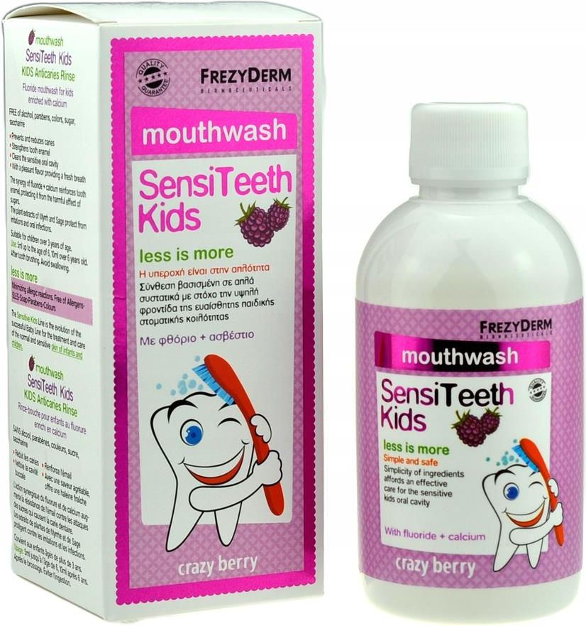 FREZYDERM SENSITEETH KID'S – Płyn do płukania jamy ustnej dla dzieci 3+ z wapniem i fluorem, smak jagodowy, 250 ml Zadbaj o codzienną higienę jamy ustnej swojego dziecka dzięki płynowi do płukania ust FREZYDERM SENSITEETH KID'S. Ten delikatny, a jednocześnie skuteczny preparat przeznaczony jest dla dzieci od 3. roku życia, które potrafią samodzielnie wypłukać usta i wypluć płyn. Skuteczna ochrona przed próchnicą i podrażnieniami ✅Płyn zawiera 125 ppm fluoru oraz wapń, które wspierają remineralizację szkliwa i wzmacniają jego strukturę. ✅Dzięki temu produkt skutecznie zapobiega rozwojowi próchnicy (już na etapie pierwszych zmian w szkliwie) oraz zmniejsza ryzyko konieczności leczenia stomatologicznego. ✅Naturalne ekstrakty z szałwii i mirry łagodzą podrażnienia dziąseł i wspierają zdrowie błon śluzowych jamy ustnej. ✅Obecny w składzie ksylitol ogranicza rozwój bakterii odpowiedzialnych za powstawanie płytki nazębnej i ubytków, jednocześnie pomagając w utrzymaniu prawidłowego pH śliny. Dlaczego warto wybrać FREZYDERM SENSITEETH KID'S? ✅ Skutecznie zapobiega próchnicy zębów mlecznych i stałych (fluor 125 ppm + wapń) ✅ Zmniejsza ilość bakterii odpowiedzialnych za płytkę nazębną i próchnicę ✅ Zawiera naturalne składniki – wyciąg z szałwii i mirry ✅ Zawiera ksylitol – wspiera zdrowe pH i mechanizmy ochronne śliny ✅ Bez alkoholu, parabenów, cukru i glutenu – idealny dla dzieci 3+ ✅ Przyjemny smak jagód – zachęca do regularnego stosowania Sposób użycia ✅Stosować po umysciu zębów. Dzieci do 6 roku życia - 5 ml bez rozcieńczania, powyżej 6 roku życia - 10 ml bez rozcieńczania. Pojemność: 250 ml ✅Skład: Aqua, Sorbitol, Glycerin, Salva Officinialis Extract, Salvia Officinialis Oil, Commiphora Myrrha Extract, Betaine Bisabobol, Calcium Glycerophosphate, Sodium Monofluorophosphate, Potassium Sorabte, Xylitol, PEG-40, Hydrogenated Castor OIl, Sodium Benzoate, Poltsorbate 20, Citric Acid, Aroma