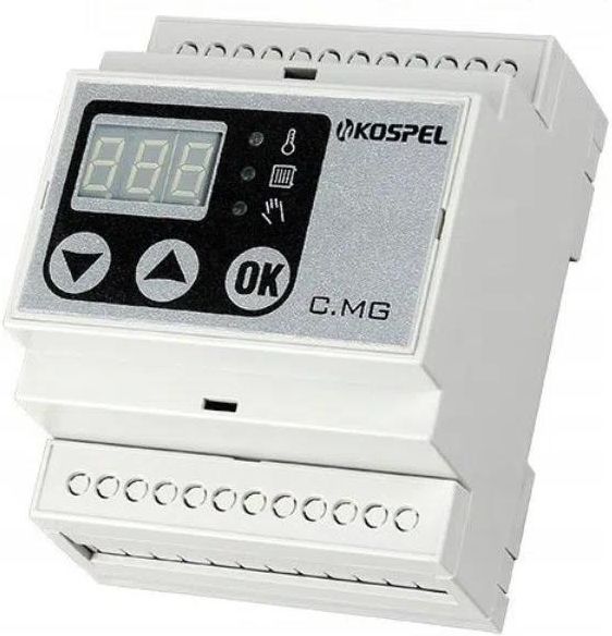 Moduł (sterownik) obiegu grzewczego jest regulatorem temperatury czynnika grzewczego w instalacji wyposażonej w zawór mieszający z siłownikiem. Mieszając czynnik grzewczy powracający z instalacji z czynnikiem pochodzącym ze źródła ciepła można uzyskać zadaną temperaturę na wyjściu zaworu (zasilaniu obiegu). Układ regulacji dokonuje tego poprzez stopniowe zamykanie lub otwieranie zaworu w określonych odstępach czasu. Sterowanie zaworem polega na podawaniu napięcia na zacisk Lo (otwieranie) lub Lz (zamykanie). W zależności od sposobu konfiguracji, sterownik może pracować jako urządzenie podrzędne systemu lub samodzielne. Cechy produktu: podłączenie: W wariancie pracy samodzielnej sterownik nie wymienia informacji z urządzeniem nadrzędnym (moduł internetowy C.MI), nie wymaga podłączenia do magistrali sterującej (komunikacyjnej). Wszystkie parametry związane z pracą urządzenia ustawiane są na panelu, zwarcie wejścia RP uruchamia proces regulacji zaworem w celu osiągnięcia zadanej temperatury na wyjściu, rozwarcie RP powoduje zamkniecie zaworu, obieg grzewczy zostaje odcięty od źródła zasilania. Aby sterownik pracował w wariancie pracy samodzielnej, należy nadać mu zerowy numer identyfikacyjny. W wariancie pracy podrzędnej sterownik wymienia informacje dotyczące parametrów pracy z modułem internetowym C.MI. Podstawowe parametry konfiguracyjne ustawiane są w menu konfiguracyjnym, natomiast pozostałe dostępne są przez stronę internetową systemu HomeAdmin2. Aby sterownik pracował w wariancie pracy podrzędnej, należy nadać mu niezerowy numer identyfikacyjny (patrz rozdział 4.2. Tryb konfiguracji podstawowej). W wariancie pracy podrzędnej powinna być założona zwora na wejściu RP, rozwarcie wejścia RP blokuje proces grzania. Wejście to można wykorzystać do blokowania grzania obiegu przez inne urządzenie. Uwaga, wejście RP jest beznapięciowe, dopuszczalne jest tylko zwieranie i rozwieranie. sterownik pracuje w trzech trybach: tryb roboczy - w zależności od konfiguracji, nastaw i zewnętrznych parametrów realizowany jest algorytm sterowania stopniem otwarcia zaworu mieszającego w celu doprowadzenia temperatury zasilania obiegu do zadanej, tryb postojowy - tryb używany poza sezonem grzewczym, zawór mieszający jest zamknięty, a pompa wyłączona. Raz dziennie w ustalonym przez użytkownika czasie (czas ochrony pompy) włączana jest pompa, a zawór mieszający otwierany jest i zamykany, co ma zapobiec zablokowaniu urządzeń podczas dłuższego postoju, tryb konfiguracji – tryb używany do ustawienia podstawowych parametrów modułu. Jeżeli sterownik skonfigurowany jest do pracy podrzędnej (współpraca z C.MI), tryby pracy ustawiane są przez urządzenie nadrzędne. Wymuszony ręczne tryb pracy z poziomu panelu sterującego zostanie zmieniony na aktualnie wymagany przez system po 30 sekundach bezczynności klawiatury. W przypadku gdy sterownik skonfigurowany jest do pracy samodzielnej, o trybie pracy decyduje użytkownik. Wyboru trybu dokonuje się za pomocą przycisków na panelu jak Dane techniczne wymiary 70 x 90 x 58 mm zasilanie: ~230V 50Hz max 170 VA zabezpieczenie: 1A zakres nastawy temperatury czynnika zasilającego obieg ogrzewanie grzejnikowe: 20 - 80ºC grzewanie podłogowe: 20 - 55ºC wyjścia pompa: ~230V 50Hz max. 150 VA siłownik zaworu: ~230V 50 Hz max. 20 VA wejścia magistrala komunikacyjna: RS 485 czujnik temperatury na wyjściu zaworu: NTC 10K (KOSPEL WE-019/01) regulator pokojowy RP: wejście beznapięciowe