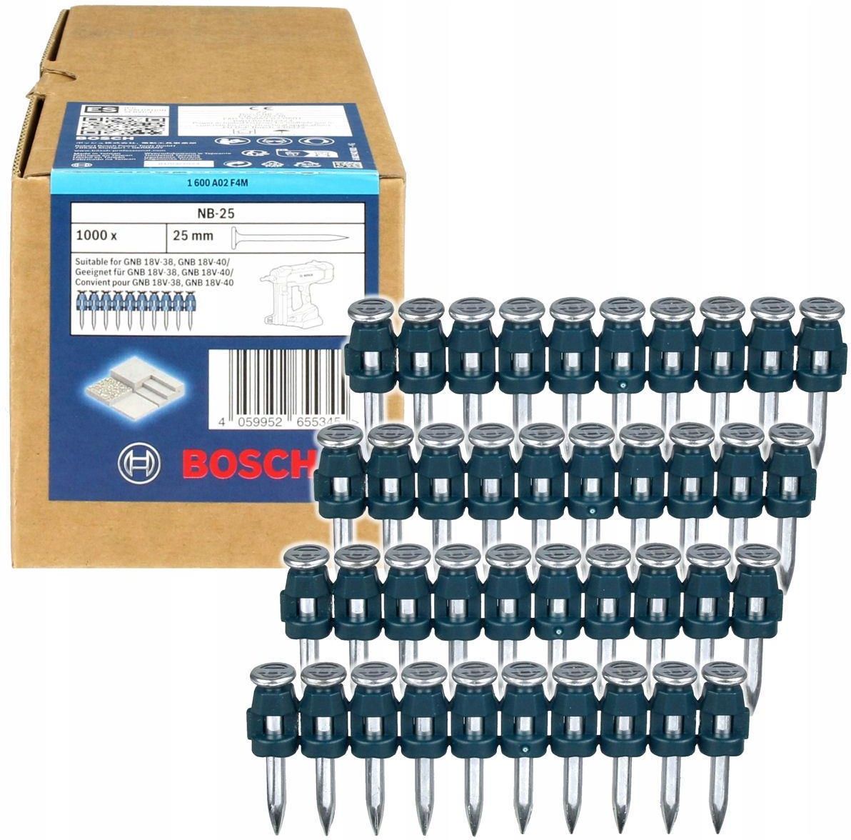 Gwoździe do betonu typ NB-25 firmy BOSCH O długości 25 mm - opakowanie 1000 sztuk. Parametry techniczne: Typ: NB-25 Średnica gwoździa: 2,7 mm Długość całkowita: 25 mm Szerokość łba: 6,25 mm Materiał wykonania: stal węglowa galwanizowana Ilość gwoździ w opakowaniu: 1000 szt. Numer katalogowy producenta: 1600A02F4M Gwoździe typ NB-25 firmy BOSCH zostały wykonane z twardej stali węglowej dzięki czemu można ich używać w twardych materiałach takich jak beton. Gwoździe galwanizowane w celu ochrony przed korozją są odpowiednie do różnorodnych prac związanych z mocowaniem w betonie. Gwoździe są przeznaczone do osadzaka firmy BOSCH: GNB 18V-38 GNB 18V-40 oraz do osadzaków innych producentów. Dostawa zawiera Gwoździe do betonu NB-25 firmy BOSCH - opakowanie 1000 sztuk