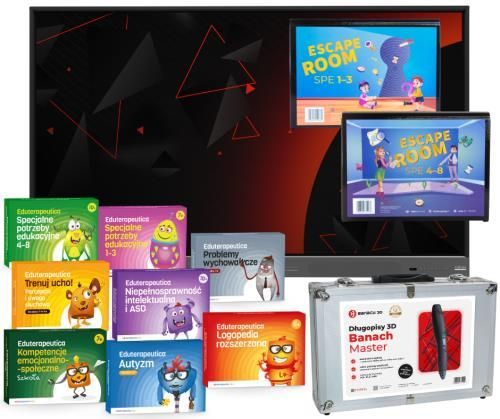 Cena uwzględnia preferencyjną stawkę VAT 0% na niektóre składowe zestawu.Zakup towaru z 0% VAT dostępny dla szkół i placówek oświatowych. Zestaw zawiera: Monitor interaktywny myBoard Grey ROCK 2.0 65" z Androidem 11.0 Eduterapeutica Lux Logopedia rozszerzona Eduterapeutica Lux SPE 1-3 Eduterapeutica Lux SPE 4-8 Eduterapeutica Lux Problemy wychowawcze. Zestaw Escape Room SPE 4-8 Escape Room SPE 1-3 Eduterapeutica Lux Niepełnosprawność intelektualna i ASD 10-15 lat Eduterapeutica Lux Autyzm Trenuj ucho! Percepcja i uwaga słuchowa Kompetencje społeczno-emocjonalne Szkoła Walizka Długopisów 3D Banach Master Dostawa Wybierz najlepsze rozwiązania dla SPE. Nowoczesny sprzęt, narzędzia i programy terapeutyczne spełniające wymogi rozporządzenia – wszystko w jednym zestawie! Do wykorzystania przez nauczycieli, logopedów podczas pracy z dziećmi o specjalnych potrzebach edukacyjnych oraz z dziećmi nie przejawiających tych zaburzeń. 1 x Monitor interaktywny myBoard GREY ROCK 2.0 Android 65" Monitor interaktywny myBoard GREY został w całości przystosowany do obsługi wysokiej rozdzielczości 4K ULTRA HD. Wyposażony w system operacyjny Android 11, posiada również funkcję ScreenShare, czyli udostępnianie wyświetlanego materiału z obustronną interakcją. 1 x Eduterapeutica Lux Logopedia rozszerzona Dzięki Aplikacji nauczyciela w programie Eduterapeutica Logopedia przeprowadzisz diagnozę oraz zaplanujesz terapię. W tym miejscu możesz także kontrolować ten proces i analizować jego efekty. To cenne źródło informacji o uczniach i wychowankach objętych pomocą psychologiczno-pedagogiczną i terapią logopedyczną, zawierające wyniki przeprowadzonych diagnoz, a także dane na temat przebiegu oraz efektów zajęć. 1 x Eduterapeutica Lux SPE 1-3 Eduterapeutica Lux Specjalne Potrzeby Edukacyjne 1-3 to zestaw ćwiczeń multimedialnych wraz z kartami pracy do wykorzystania na zajęciach z dziećmi z ryzykiem wystąpienia lub orzeczeniem/opinią o dysleksji, dysgrafii, dysortografii lub dyskalkulii. Materiały zawarte w programie można wykorzystać nie tylko podczas grupowych lub indywidualnych zajęć wyrównawczych, rewalidacyjnych i korekcyjno-kompensacyjnych, ale także w pracy z całą klasą. 1x Eduterapeutica Lux SPE 4-8 Eduterapeutica lux SPE 4-8 to program multimedialny, który wzbudza zainteresowanie uczniów. Motywuje ich do aktywnego udziału w zajęciach terapii pedagogicznej i systematycznego treningu. 1x Eduterapeutica Lux Problemy wychowawcze. Zestaw Zestaw pomocy kompleksowo wspierające szkołę (dyrektora, nauczycieli, wychowawców i specjalistów) oraz rodziców w obszarach z problemami rozwojowymi w zakresie psychologicznym i społecznym uczniów w rożnym wieku. Zestaw „Problemy wychowawcze” pozwala przygotować szkołę podstawową do skutecznego przeciwdziałania przemocy, agresji i uzależnieniom, a także wspierania rodziców i dzieci z problemami emocjonalnymi. 1x Escape Room SPE 4-8 Zestaw Escape Room SPE 4-8 przeznaczony jest dla uczniów z klas 4-8 na zajęcia korekcyjno-kompensacyjne, dodatkowo mogą być wykorzystywane na zajęciach świetlicowych, świetlicach profilaktycznych, godzinach do dyspozycji wychowawcy, bowiem poruszają wiele tematów wychowawczo-społecznych. 1x Escape Room SPE 1-3 ESCAPE ROOM SPE 1-3 pozwoli na ciekawe przeprowadzenie zajęć lekcyjnych. Gra sprawdza się w indywidualnej terapii jaki i tej grupowej. Niezależnie od potrzeb uczniów, dostosujesz ją do potrzeb każdego ucznia SPE. 1x Eduterapeutica Lux Niepełnosprawność intelektualna i ASD 10-15 lat Publikacja skierowana jest dla młodzieży i dorosłych osób z niepełnosprawnością i ASD. Pedagodzy specjalni, nauczyciele i terapeuci mogą wykorzystać karty pracy podczas zajęć rewalidacyjnych w szkołach i innych ośrodkach. Przygotowane materiały sprawdzą się również podczas zajęć z funkcjonowania osobistego i społecznego oraz zajęć rozwijających umiejętność komunikowania się. Dużym atutem jest możliwość wykorzystania ich podczas działań praktycznych np. podczas spotkań z reprezentantami różnych zawodów. 1x Eduterapeutica Lux Autyzm Eduterapeutica LUX Autyzm to zestaw praktycznych i różnorodnych materiałów, zebranych w jednym miejscu. Dostosowany dla całego grona pedagogicznego. W zestawie zawarto przydatne wskazówki, szczególnie dla nauczycieli klas 1-8. Wyjaśniamy, jak zachować się w pracy z uczniem ze spektrum autyzmu oraz jak przygotować całą klasę do integracji z uczniem z ASD. 1x Trenuj ucho! Percepcja i uwaga słuchowa Dzieci z problemami z koncentracją słuchową mają problem, aby skoncentrować się na lekcji. Nadmiar bodźców słuchowych, które współcześnie docierają do młodego człowieka rozprasza go. Przez to nie są w stanie w pełni skupić się na tym, co mówi, jakie treści i polecenia przekazuje nauczyciel. W szumie oraz hałasie uczniowie często nie są w stanie wychwycić ważnych informacji. Problemy z koncentracją słuchową w bezpośredni sposób przekładają się na problemy w nauce oraz na słabe efekty terapii logopedycznej. 1x Kompetencje społeczno-emocjonalne Szkoła EDUTERAPEUTICA LUX - Kompetencje emocjonalno-społeczne Szkoła to ćwiczenia interaktywne i karty pracy, które pomagają kształtować umiejętności związane z rozpoznawaniem i akceptacją różnych stanów emocjonalnych (swoich i innych), radzenia sobie z trudnymi emocjami, kulturalnego zachowania w sytuacjach społecznych, a dodatkowo wzmacniają myślenie przyczynowo-skutkowe, strategiczne, problemowe i przestrzenne. 1x Walizka Długopisów 3D Banach Master Przygotowane do zastosowania na różnorodnych zajęciach przedszkolnych i szkolnych – zawierają kompletny zestaw edukacyjny w wersji dostępu online do największej obudowy dydaktycznej, ponad 300 kart pracy, szablonów, scenariuszy, inspiracji.