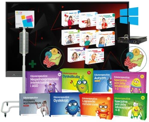 PROPOZYCJE WYPEŁNIENIA WNIOSKÓW DLA ZESTAWU: WNIOSEK B Cena uwzględnia preferencyjną stawkę VAT 0% na niektóre składowe zestawu. Zakup towaru z 0% VAT dostępny dla szkół i placówek oświatowych. Zestaw SPE 7 zawiera: 1 x Monitor interaktywny myBoard 75" GREY ROCK 4K z Androidem 11.0 1 x Komputer myBoard OPS i3-1115G4 (i3-1115G4/4GB/128GB SSD) 1 x Windows 11 Pro Edu 1 x Pakiet aplikacji dla PC – Rewalidacja z Happy Stones 1 x Smartfloor Mobile Audio - Niezwykła podłoga interaktywna 1 x Rewalidacja z Happy Stones (Interakcja ruchem) 1 x Eduterapeutica LUX - AUTYZM 1 x Eduterapeutica LUX - NIEPEŁNOSPRAWNOŚĆ INTELEKTUALNA I ASD 10-15 lat 1 x Eduterapeutica LUX - LOGOPEDIA ROZSZERZONA - przedszkole, nauczanie wczesnoszkolne 1 x Eduterapeutica LUX - DYSLEKSJA - szkoła podstawowa 1 x Eduterapeutica LUX - DYSKALKULIA - szkoła podstawowa 1 x Eduterapeutica LUX - SPECJALNE POTRZEBY EDUKACYJNE - szkoła podstawowa klasy 1-3 1 x Eduterapeutica LUX - SPECJALNE POTRZEBY EDUKACYJNE - szkoła podstawowa klasy 4-8 1 x Eduterapeutica LUX - PROBLEMY WYCHOWAWCZE - szkoła podstawowa klasy 1-8 1 x HARMONIJNY ROZWÓJ - licencja otwarta dla placówki 1 x Dostawa, 1 x Monitor interaktywny myBoard 75" GREY ROCK 4K z Androidem 11.0 myBoard GREY ROCK to pierwszy w tej serii monitor z systemem operacyjnym Android w wersji 11.Bogata funkcjonalność, jak profile użytkownika, nowoczesny i innowacyjny port USB All in One typu C, czterordzeniowy procesor wspomagany przez aż 8 GB pamięć RAM i ekran w wysokiej rozdzielczości 4K Ultra HD to gwarancja bezpieczeństwa, szybkości działania oraz komfortu pracy podczas zajęć lekcyjnych. Monitor wyposażony został również w 6 najnowszych portów USB 3.0. 1 x Komputer myBoard OPS i3-1115G4 (i3-1115G4/4GB/128GB SSD) Komputery OPS (Open Pluggable Specification) to moduły komputerowe przeznaczone do rozszerzania możliwości monitorów interaktywnych firmy myBoard o opcję zainstalowania standardowego systemu operacyjnego typu Windows. Dzięki zastosowaniu nowoczesnych procesorów i szybkich pamięci operacyjnych oraz integracji z monitorem interaktywnym myBoard, tego typu rozwiązanie to łatwy i szybki sposób na zastąpienie standardowego komputera i uzyskanie podwójnego systemu operacyjnego z wieloma dodatkowymi portami. 1 x Windows 11 Pro Edu 1 x Pakiet aplikacji dla PC – Rewalidacja z Happy Stones Happy Stones to zestaw interaktywnych zabaw i ćwiczeń ruchowych do wykorzystania podczas zajęć rewalidacyjnych z dziećmi na monitorze interaktywnym. Proponowane ćwiczenia stymulują w szczególności percepcję wzrokową, myślenie logiczne i abstrakcyjne oraz spostrzegawczość. Rozwijają umiejętności językowe, a także zachęcają do podejmowania inicjatywy i działania, także tych związanych z aktywizacją społeczną, poprzez możliwość pracy w grupie. Przyjazna, spokojna grafika stymuluje nie tylko oko, ale i kubki smakowe. Szykujcie się na apetyczną i mądrą zabawę! 1 x Smartfloor Mobile Audio Rewalidacja - Niezwykła podłoga interaktywna SmartFloor Mobile Audio to nowy, gotowy interaktywny zestaw, zawierający niezwykłą podłogę interaktywną SmartFloor oraz statyw mobilny z głośnikami, pozwalający na jeszcze lepsze wrażenia z zabawy i nauki. Statyw mobilny umożliwia bezproblemowe przemieszczanie podłogi interaktywnej w dowolne miejsce, a także wyświetlenie obrazu wszędzie tam, gdzie nie ma możliwości zamontowania projektora . W połączeniu z pakietem aplikacji „Rewalidacja z Happy Stones” SmartFloor zapewnia interaktywną zabawę i ćwiczenia ruchowe do wykorzystania podczas zajęć rewalidacyjnych z dziećmi. 1 x Eduterapeutica LUX - AUTYZM Eduterapeutica LUX Autyzm to zestaw praktycznych i różnorodnych materiałów, zebranych w jednym miejscu. Dostosowany dla całego grona pedagogicznego. W zestawie zawarto przydatne wskazówki, szczególnie dla nauczycieli klas 1-8. Wyjaśniamy, jak zachować się w pracy z uczniem ze spektrum autyzmu oraz jak przygotować całą klasę do integracji z uczniem z ASD. Scenariusze zajęć i pomoce mają służyć do nawiązania dobrych relacji i komunikacji między nauczycielem a uczniem z ASD, natomiast zadania i ćwiczenia dla wszystkich uczniów ułatwiają pokonanie dystansu fizycznego i pomagają w rozwijaniu kompetencji społecznych u osób z zaburzeniami ze spektrum autyzmu. 1 x Eduterapeutica LUX - LOGOPEDIA ROZSZERZONA - przedszkole, nauczanie wczesnoszkolne Dzięki aplikacji nauczyciela w programie Eduterapeutica Logopedia przeprowadzisz diagnozę oraz zaplanujesz terapię. W tym miejscu możesz także kontrolować ten proces i analizować jego efekty. To cenne źródło informacji o uczniach i wychowankach objętych pomocą psychologiczno-pedagogiczną i terapią logopedyczną, zawierające wyniki przeprowadzonych diagnoz, a także dane na temat przebiegu oraz efektów zajęć. Aplikacja nauczyciela umożliwia również przeprowadzenie wstępnej diagnozy pedagogicznej z orientacyjną oceną gotowości szkolnej oraz oceny ryzyka dysleksji i dyskalkulii. Program jest wyposażony w test prediagnostyczny, dzięki któremu szybko sprawdzisz, czy dziecko posługuje się komputerem na tyle sprawnie, aby uczestniczyć w multimedialnej terapii. 1 x Eduterapeutica LUX - DYSLEKSJA - szkoła podstawowa Eduterapeutica Lux Dysleksja jest pomocna w pracy z dziećmi w oddziałach terapeutycznych i oddziałach integracyjnych, a wypadku dzieci z większymi deficytami rozwoju intelektualnego również w starszym wieku. Program terapeutyczny wykorzystuje powszechnie uznaną metodę 18 struktur wyrazowych, która umożliwia pogłębienie umiejętności analizy i syntezy wyrazów. Jest to metoda przeznaczona do jednoczesnego ćwiczenia czytania i pisania na tym samym materiale leksykalnym w oparciu o uaktywnianie analizatorów: wzrokowego, słuchowego i kinestyczno-ruchowego. 1 x Eduterapeutica LUX - DYSKALKULIA - szkoła podstawowa Eduterapeutica LUX Dyskalkulia to zestaw ćw