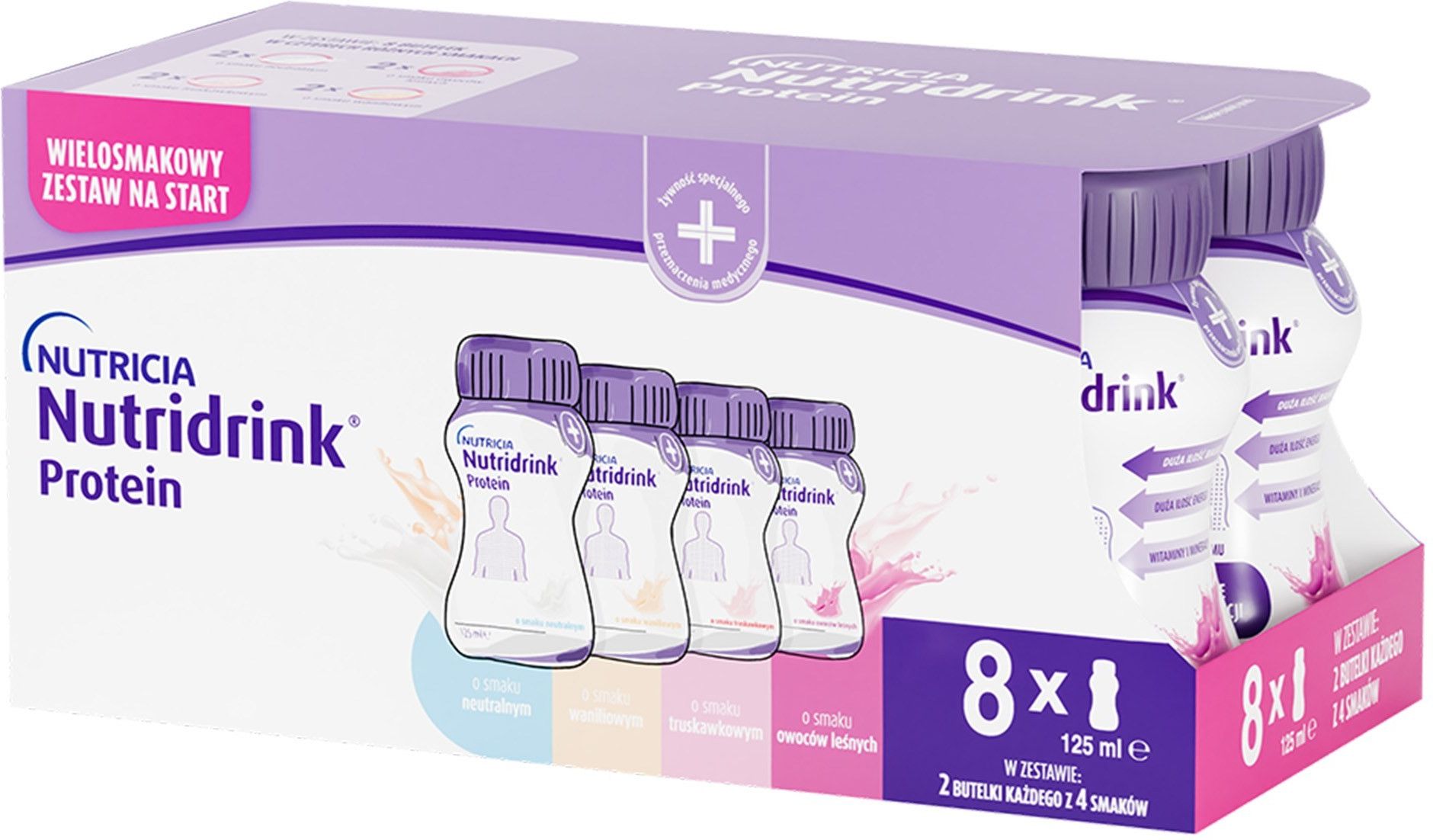 Wielosmakowy zestaw na start Nutridrink Protein Zestaw zawiera: Nutridrink Protein o smaku owoców leśnych - 2 butelki (2x125 ml), Nutridrink Protein o smaku truskawkowym – 2 butelki (2x125 ml), Nutridrink Protein o smaku waniliowym – 2 butelki (2x125 ml) Nutridrink Protein o smaku neutralnym - 2 …