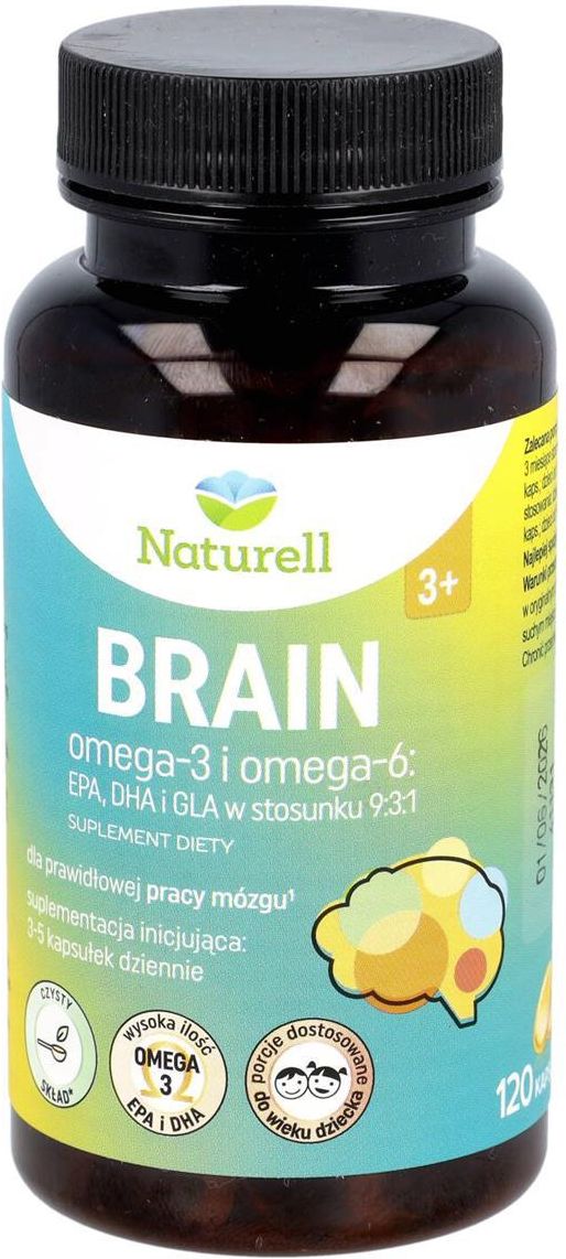 Usp Zdrowie Naturell Brain Omega-3 I Omega-6 120 kaps. Naturell Brain to suplement diety dla dzieci powyżej 3 roku życia i dorosłych. Ma postać żelowych kapsułek wypełnionych olejem rybnym zawierającym cenne kwasy EPA i DHA oraz olejem z wiesiołka dwuletniego zawierającym kwas GLA. Kwasy omega-3 pełnią wiele ważnych ról w organizmie człowieka, podobnie jak kwas omega-6 (GLA) nie są przez niego syntetyzowane i muszą być dostarczane wraz z pożywieniem. Naturell Brain zawiera wysoką ilość kwasów omega-3: eikozapentaenowego (EPA) i dokozaheksaenowego (DHA) w połączeniu z kwasem omega-6: gamma-linolenowym (GLA), w stosunku ilościowym odpowiednio 9:3:1. Źródłem kwasów omega-3 (EPA i DHA) w produkcie Naturell Brain jest wysokiej jakości olej z ryb pelagicznych (sardynek, sardeli i makreli lub ich kombinacji, poławianych na południowym Pacyfiku, pochodzących ze zrównoważonych połowów), tj. tłustych ryb morskich. GLA (kwas omega-6) pochodzi z oleju z nasion wiesiołka dwuletniego tłoczonego na zimno. GLA z tego źródła roślinnego charakteryzuje się dobrym stopniem wchłaniania i wykorzystania przez organizm. Co wyróżnia Naturell Brain? Czysty skład - bez przeciwutleniaczy i barwników syntetycznego pochodzenia. Omega-3 (EPA i DHA) w naturalnej trójglicerydowej formie - czyli takiej, jaka naturalnie występuje w pożywieniu. Dzięki temu mogą być lepiej przyswajane przez organizm. Technologia produkcji Golden Omega® redukuje poziom trwałych zanieczyszczeń organicznych (dioksyn i PCB) oraz metali ciężkich z oleju rybnego. Niski wynik wskaźnika TOTOX ≤ 9 dla oleju z ryb, który świadczy o niskim stopniu utlenienia oleju - im niższa wartość wskaźnika TOTOX, tym lepsza jakość oleju; niski stopień utlenienia oleju z ryb przekłada się na łagodny smak i zapach oraz redukcję rybnego posmaku. Niski wynik w 18-stopniowej skali Gardnera ≤ 2 dla oleju z ryb - im niższa wartość na skali, tym jaśniejsza barwa oleju, co oznacza, że jest on mniej utleniony. Omega-6 (GLA) w naturalnej postaci trójglicerydów – olej z wiesiołka standaryzowany na zawartość GLA (9%). Zastosowanie Suplementacja diety w składniki aktywne produktu przeznaczona dla dzieci od 3. roku życia, które potrafią samodzielnie połknąć kapsułkę oraz dorosłych. Zalecane spożycie Przez pierwsze 3 miesiące stosowania: dzieci 3-5 lat: 3 kapsułki dziennie, dzieci 6-7 lat: 4 kapsułki dziennie, dzieci od 8 roku życia i dorośli: 5 kapsułek dziennie. Po 3 miesiącach  stosowania: dzieci 3-5 lat: 2-3 kapsułki dziennie, dzieci 6-7 lat: 2-3 kapsułki dziennie, dzieci od 8 roku życia i dorośli: 2-3 kapsułki dziennie. Składniki Olej rybny zawierający kwas eikozapentaenowy (EPA) i kwas dokozaheksaenowy (DHA); olej z nasion wiesiołka dwuletniego (Oenothera biennis) zawierający kwas gamma-linolenowy (GLA); żelatyna; substancja utrzymująca wilgoć: glicerol; substancja słodząca: ksylitol; witamina E (D-alfa-tokoferol); przeciwutleniacz: mieszanina tokoferoli; naturalny aromat.   2 kapsułki zawierają: kwasy EPA 264 mg, kwasy DHA 88 mg, kwasy GLA 29,3 mg, witamina E 8 mg (67%)*. 3 kapsułki zawierają: kwasy EPA 396 mg, kwasy DHA 132 mg, kwasy GLA 44 mg, witamina E 12 mg (100%)*. 4 kapsułki zawierają: kwasy EPA 528 mg, kwasy DHA 176 mg, kwasy GLA 58,6 mg, witamina E 16 mg (133%)*. 5 kapsułek zawiera: kwasy EPA 660 mg, kwasy DHA 220 mg, kwasy GLA 73,3 mg, witamina E 20 mg (167%)*. *RWS - Referencyjna Wartość Spożycia Ostrzeżenia: Nie należy spożywać w przypadku nadwrażliwości na którykolwiek składnik preparatu. Należy zachować ostrożność podczas stosowania preparatów zawierających olej z wiesiołka u osób z padaczką (zwłaszcza u osób ze schizofrenią i/lub przyjmujących fenotiazyny) oraz stosujących leki przeciwzakrzepowe. Nie zaleca się stosowania przez kobiety w ciąży i karmiące piersią. Suplementy diety nie mogą być stosowane jako substytut (zamiennik) zróżnicowanej diety ani zdrowego trybu życia. Nie należy przekraczać zalecanej porcji produktu do spożycia w ciągu dnia. Suplementy diety powinny być przechowywane w sposób niedostępny dla małych dzieci. Przed zastosowaniem produktu sugerujemy zapoznanie się z dokładnymi informacjami podanymi na opakowaniu lub załączonej ulotce.