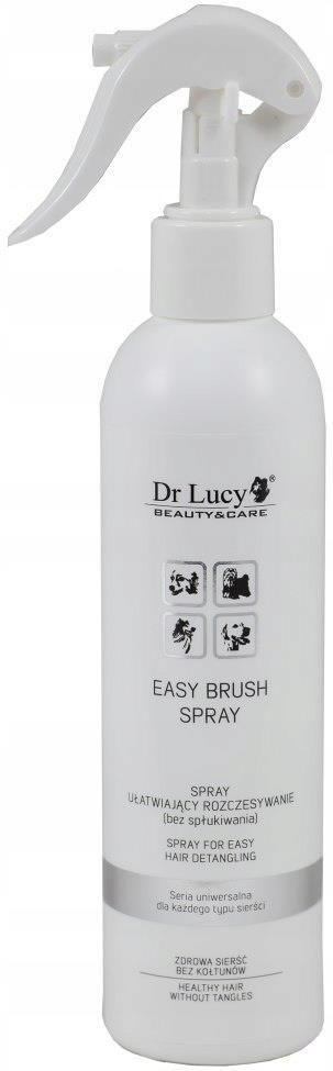 Spray ułatwiający rozczesywanie Dr Lucy Dr Lucy Pro Easy Brush to spray do rozczesywania sierści to produkt, który jako opiekun psa z długimi włosami, skłonnymi do kołtunienia się warto mieć w swoim domu. Podobnie jak inne kosmetyki dla psów marki Dr Lucy spray ułatwiający rozczesywanie sierści powstał we współpracy z groomerami i jest przetestowany dermatologicznie. Dzięki temu możesz mieć pewność, że jest on bezpieczny dla Twojego pupila. Błyskawicznie nawilża i odżywia włosy, dzięki temu sierść staje się lśniąca i odzyskuje zdrowy wygląd. Regenerujący spray ułatwiający rozczesywania sierści gwarantuje dużą skuteczność w walce z kołtunami u naszego pupila i jest niezbędny każdemu właścicielowi psa z tendencją do splątywania się i kołtunienia włosa. Płyn do rozczesywania włosów u psa nadaje się dla każdego rodzaju sierści. Nie wymaga spłukiwania. Sposób użycia: Na wilgotne lub suche włosy w miejscach splątanych nanieść spray z odległości ok. 30 cm, delikatnie wmasować we włosy, pozostawić na 10-15 min. Po tym czasie powoli rozczesywać, do osiągnięcia pożądanego efektu. Przy sierści skłonnej do splątania zalecane jest nanoszenie sprayu przed każdym czesaniem i szczotkowaniem. Pojemność: 250 ml