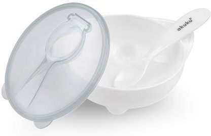 Akuku Miseczka z łyżeczką w kolorze białym Wskazania: Akuku Miseczka z łyżeczką w kolorze białym to zestaw do karmienia małych dzieci. Dzięki dołączonej do zestawu pokrywce sprawdza się zarówno w domu, jak i na spacerze bądź w podróży. Właściwości: Zestaw do karmienia dzieci składający się z miseczki, łyżeczki oraz pokrywki. Wykonany z bezpiecznych materiałów przeznaczonych do kontaktu z żywnością, całkowicie wolny od bisfenolu A (0% BPA).Miseczka o pojemności 250 ml pozwala zarówno na podawanie, jak i na przechowywanie pokarmu. Pokrywka szczelnie chroni jedzenie, a specjalna komora umożliwia przechowywanie łyżeczki, dzięki czemu uchronimy ją przed zgubieniem oraz zachowamy w czystości. Miseczka może być używana w kuchence mikrofalowej. Podczas podgrzewania w mikrofali nie używać pokrywki.Produkt może być myty w zmywarce. Stosowanie: Do podawania i przechowywania pożywienia.Po użyciu produkt należy dokładnie umyć i pozostawić do wyschnięcia. Miseczka może być używana w kuchence mikrofalowej (bez pokrywki!) i myta w zmywarce. Opakowanie: Miseczka 250 ml – 1 sztukaŁyżeczka – 1 sztukaPokrywka- 1 sztuka
