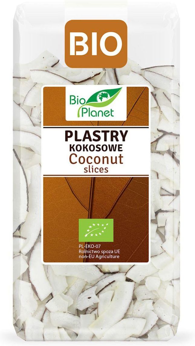 PLASTRY KOKOSOWE BIO 250 g - BIO PLANET BIO PLANET - seria BRĄZOWA (orzechy i pestki) SKŁADNIKI ekologiczne plastry kokosowe 100 %. OPIS Suszone, pyszne i chrupiące plastry kokosów są doskonałym zamiennikiem dla konwencjonalnych słodyczy. Znakomicie smakują jako samodzielna przekąska, jak również w musli i płatkach śniadaniowych. WARTOŚĆ ODŻYWCZA W 100 g Wartość energetyczna 2939 kJ/714 kcal Tłuszcz 70 g w tym kwasy tłuszczowe nasycone 66 g Węglowodany 5,3 g w tym cukry 5,1 g Błonnik 13 g Białko 8,6 g Sól 0,05 g ZALECANE WARUNKI PRZECHOWYWANIA Przechowywać w suchym i chłodnym miejscu. Jednostka: szt Masa brutto: 0,267 Kategoria specjalna: _Orzechy, kasztany, wiórki kokosowe; _SUPER DEBIUTY; _WSZYSTKIE; _*** Wysokość opakowania jednostkowego (cm): 16.00 Masa netto (g): 250 Głębokość opakowania jednostkowego (cm): 5.00 Gwarantowany termin przydatności (w dniach): 60 Szerokość opakowania jednostkowego (cm): 8.00 Bez Cukru: BEZ CUKRU (w składnikach) BEZ GLUTENU (w składnikach): BEZ GLUTENU (w składnikach) Producent: BIO PLANET - seria BRĄZOWA (orzechy i pestki) PRODUCENT / DYSTRYBUTOR – NAZWA I ADRES: BIO PLANET S.A., WILKOWA WIEŚ 7, 05-084 LESZNO CERTYFIKAT BIO: CERTYFIKAT BIO Kraj pochodzenia: Sri Lanka Kraj pochodzenia składników (słownik BP): Sri Lanka WEGAŃSKI: WEGAŃSKI WEGETARIAŃSKI: WEGETARIAŃSKI Orientacyjny termin przydatności: 16.08.2026