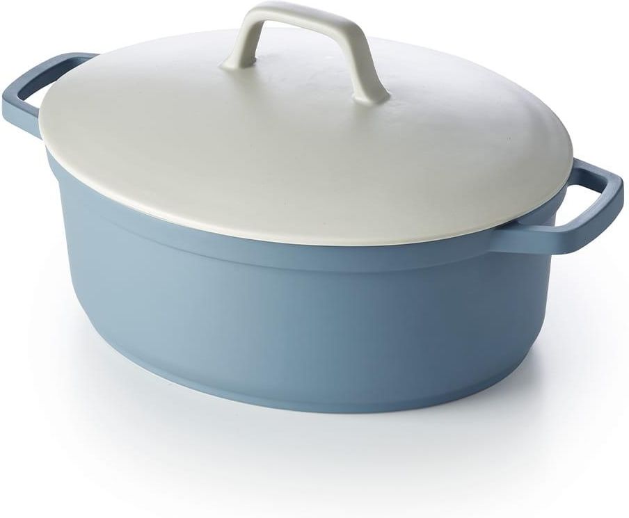 Brytfanna do zapiekania lub owalny garnek, korzystaj jak chcesz Brytfanna została wykonana z aluminium, które jest najlepszym przewodnikiem ciepła, co oznacza, że gotowanie na małym lub średnim ogniu wystarcza do osiągniecia odpowiedniej temperatury gotowania. Co w efekcie przekłada się na oszczędność czasu oraz mniejsze zużycie energii. Naczynie jest wręcz idealne do wolnego gotowania, duszenia oraz pieczenia. Od wewnątrz pokryte jest ceramiczną powłoką nieprzywierającą, która zapobiega przywieraniu potraw i ułatwia czyszczenie. Do brytfanny dołączona jest solidna, ceramiczna pokrywka. Na jej dnie umieszczone są małe wypustki, które ułatwiają skraplanie się pary wodnej na jej powierzchni. Dzięki połączeniu tych dwóch materiałów (aluminium i ceramika) w brytfannie podczas gotowania i pieczenia powstaje dodatkowa wilgoć, na wskutek różnic temperatur pomiędzy szybko nagrzewającym się aluminium, a ceramiką, która dłużej pozostaje chłodna. Powstała wilgoć skrapla się i wraca do potrawy, dzięki temu dania gotują się w sosie własnym. Brytfanna działa na wszystkich źródłach ciepła (np. kuchenka gazowa, ceramiczna, kuchenka indukcyjna), można jej również używać w piekarniku w max temperaturze 250°C. Zalecane mycie ręczne. Naczynia z serii Papillon wyglądają jak tradycyjne, ciężkie żeliwne garnki do zapiekanka (garnki holenderskie), ale to, co widać, nie jest tym, co tak naprawdę dostajesz. Te nowoczesne naczynia posiadają podobne właściwości jak tradycyjne żeliwo, szybko nagrzewają się, idealnie rozprowadzają ciepło, ale są znacznie lżejsze i łatwiejsze w utrzymaniu.