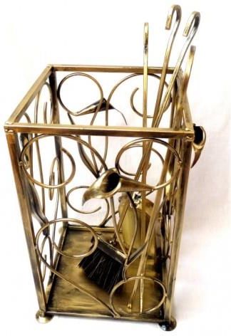 STOJAK NA AKCESORIA KOMINKOWE nr DK-858 Solidny stojak kominkowy z akcesoriami wykonany z metalu. Wymiar 24 cm x 24 cm, wysokość 42 cm W zestawie : łopatka, pogrzebacz, miotełka i chwitak ( każdy z elementów o dł 55 cm) Bardzo praktyczna ozdoba każdego kominka.