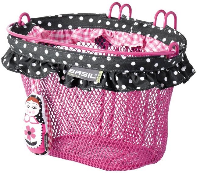 Kosz na kierownicę BASIL JASMIN BABOUSHKA BASKET JUNIOR mocowanie na haki 12"-20", stalowy różowy Kosz Basil Jasmin z ozdobną falbanką i dekoracją Baboushka jest specjalnie zaprojektowany dla dzieci. Posiada owalny kształt i mniejsze wymiary, co ułatwia dopasowanie do mniejszych rowerów. Wykonany z drobnej stalowej siatki. Łatwe mocowanie na kierownicy za pomocą podwójnych haków. Zdejmowany kosz wyposażony w wygodny uchwyt do przenoszenia. Idealny dodatek do roweru każdej małej dziewczynki. Wymiary: 28 cm x 20 cm x 18 cm Waga: 0,5 kg Materiał: stal Pozycja na rowerze: Przód Mocowanie: na kierownicę HISTORIA BASIL Jesteśmy firmą Basil. Chcemy, zobaczyć jak cieszysz się jazdą na swoim rowerze, dlatego robimy piękne i funkcjonalne akcesoria rowerowe, które zachęcają do jazdy jeszcze częściej. Ponieważ jazda na rowerze jest zdrowa i daje dzienną dawkę szczęścia i wysiłku. Wszystko zaczęło się 40 lat temu, kiedy Ine van Dam wszedł do sklepu rowerowego Nico van Balveren. Szukała wiklinowego kosza do swojego roweru. Nico opracował taki kosz i uczynił Ine bardzo szczęśliwą. A najważniejszą rzeczą było to, że z powodu tego kosza polubiła przejażdżki rowerem jeszcze bardziej. Niezbyt wiele zmieniło się w naszej rodzinnej firmie od tamtego czasu. Naszą pasją jest opracowywanie produktów, które sprawiają, że jazda na rowerze jest bardziej atrakcyjna i przyjemna. I zawsze bierzemy pod uwagę Wasze życzenia. Chcemy zrozumieć, kiedy i dlaczego jeździsz na rowerze. A także dlaczego i kiedy nie jeździsz. Uczymy się tego każdego dnia. Łączymy te informacje z naszym poczuciem jakości, stylu i funkcjonalności. Razem możemy szerzyć radość z jazdy rowerowej. Dołączysz do nas? W imieniu zespołu Basil, Marthijn van Balveren.