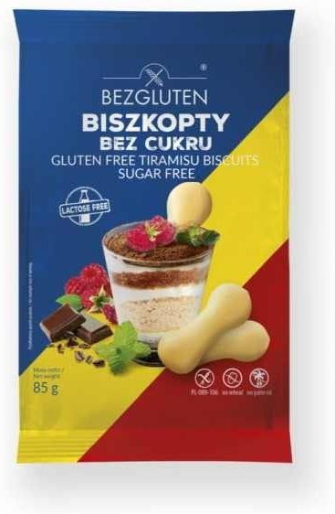BEZGLUTEN Biszkopty bez cukru 85g Masa netto:85g Producent: BEZGLUTEN Tradycyjne biszkoptowe języczki uwielbiają zarówno dzieci, jak i dorośli. Biszkopty dostępne w naszym sklepie nie zawierają cukru dodanego. Oznacza to, że są zdrowszą wersją klasycznych słodyczy. Biszkopty bez glutenu doskonale sprawdzą się na przyjęciach dla dzieci, szkolnych przyjęciach lub jako słodka przekąska dla gości. Biszkoptowe języczki dla dzieci bez cukru są bardzo lekkie i miękkie, tak że rozpływają się w ustach.Biszkopty kocie języczki, zwane też ladyfingers są często używane w deserach jako element dekoracyjny. Najpopularniejszym deserem z dodatkiem bezglutenowych biszkoptów jest tiramisu, które często gości na stołach podczas okolicznościowych przyjęć. Nasze biszkopty bezglutenowe bez cukru są dosładzane maltitolem. Jest to naturalna substancja słodząca, która nie zmienia właściwości pod wpływem wysokiej temperatury, jak dzieje się to w przypadku aspartanu. Jest bezpiecznym słodzikiem, który pod względem smaku dorównuje zwykłemu cukrowi białemu. Składniki Jaja, skrobia kukurydziana, substancja słodząca: maltitol; skrobia ziemniaczana, błonnik bambusowy, woda, emulgatory: mono- i diglicerydy kwasów tłuszczowych, estry kwasów tłuszczowych i poliglicerolu; substancja zagęszczająca: guma guar. jajaWartość odżywcza produktu w 100g: Wartość energetyczna: 1769 kJ/419 kcal Tłuszcz: 9,3 g w tym kwasy tłuszczowe: 3,8 g Węglowodany: 72 g W tym cukry: 0,2 g Błonnik: 1,7 g Białko: 11 g Sól: 0,3 g