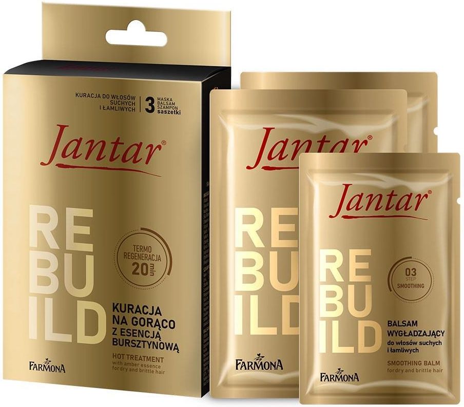 Jantar Kuracja na gorąco z esencją bursztynową do włosów suchych i łamliwych, 20 ml + 20 ml + 10 ml 🔥 Jantar Kuracja na gorąco z esencją bursztynową do włosów suchych i łamliwych, 20 ml + 20 ml + 10 ml Odbudowująca kuracja na gorąco Jantar została stworzona, aby intensywnie regenerować i odbudowywać włosy suche i łamliwe. Dzięki ciepłu składniki aktywne skuteczniej przenikają w głąb włosa, przywracając mu witalność, nawilżenie oraz ułatwiając rozczesywanie i wygładzając włosy. Efekty 💧 Nawilżone i miękkie włosy 💪 Mocne i odporne na łamanie pasma 🌟 Pełne witalności i jedwabiście gładkie włosy 🪄 Ułatwione rozczesywanie i naturalny blask 💇‍♀️ Sposób użycia Krok 1. Regenerująca maska olejowa: Umieść saszetkę z maską w miseczce z gorącą wodą na około 1 minutę. Wmasuj ciepłą maskę w suche włosy i rozczesz je. Nałóż dołączony foliowy czepek i owiń ręcznikiem. Pozostaw na 20 minut, następnie spłucz. Krok 2. Szampon nawilżający: Nanieś na wilgotne włosy zawartość saszetki z szamponem, masuj do uzyskania piany i spłucz. Krok 3. Balsam wygładzający: Rozprowadź na wilgotnych włosach zawartość saszetki z balsamem i spłucz po chwili. Jeśli włosy wymagają intensywnej regeneracji, pozostaw balsam bez spłukiwania. 💚 Składniki aktywne 🌳 Esencja bursztynowa – intensywnie regeneruje i wzmacnia włosy 🥥 Olejek kokosowy – odżywia i nawilża 🥑 Olejek awokado – regeneruje i wygładza 🌰 Olejek arganowy – odbudowuje i wzmacnia strukturę włosa 🌸 Proteiny jedwabiu – nadają włosom elastyczność i miękkość Ostrzeżenia i środki ostrożności 🔴 Tylko do użytku zewnętrznego. ⚠️ Unikać kontaktu z oczami. W razie dostania się do oczu natychmiast spłukać wodą. 👶 Przechowywać poza zasięgiem dzieci. 📋 Skład INCI Maska: Aqua (Water), Dimethicone, Persea Gratissima (Avocado) Oil, Cetearyl Alcohol, Cocos Nucifera (Coconut) Oil, Glycerin, Hydrolyzed Silk, Behentrimonium Chloride, Simmondsia Chinensis (Jojoba) Seed Oil, Argania Spinosa (Argan) Kernel Oil, Amber Extract, Urea, Starch Hydroxypropyltrimonium Chloride, Sodium Lactate, Lactic Acid, Sodium Chloride, Tocopheryl Acetate, Propylene Glycol, Dimethiconol, Hydroxyethylcellulose, Isopropyl Alcohol, Phenoxyethanol, Ethylhexylglycerin, Sodium Benzoate, Parfum (Fragrance), Limonene. Szampon: Aqua (Water), Sodium Laureth Sulfate, Urea, Cocamidopropyl Betaine, Sodium Chloride, Inulin, Soluble Collagen, Sodium Cocoamphoacetate, Panthenol, Amber Extract, Polyglyceryl-3 Caprate, Polyquaternium-10, Silicone Quaternium-22, Lactic Acid, Palmitamidopropyltrimonium Chloride, Propylene Glycol, Dipropylene Glycol, Citric Acid, Disodium EDTA, Sodium Benzoate, Potassium Sorbate, Phenoxyethanol, Parfum (Fragrance), Linalool, Limonene, Hexyl Cinnamal. Balsam: Aqua (Water), Cetearyl Alcohol, Distearoylethyl Dimonium Chloride, Glycerin, Dimethicone, Equisetum Arvense (Horsetail) Leaf Extract, Inulin, Laurdimonium Hydroxypropyl Hydrolyzed Wheat Protein, Laurdimonium Hydroxypropyl Hydrolyzed Wheat Starch, Hydrolyzed Keratin, Panthenol, Cetrimonium Chloride, Hydroxyethylcellulose, Disodium EDTA, Phenoxyethanol, Ethylhexylglycerin, Sodium Benzoate, Potassium Sorbate, Citric Acid, Parfum (Fragrance). *Skład produktu może ulegać zmianom – zawsze sprawdź aktualny skład na opakowaniu. 🌟 Podsumowanie Jantar Kuracja na gorąco z esencją bursztynową to zaawansowany rytuał pielęgnacyjny dla włosów suchych i łamliwych. Dzięki synergii naturalnych olejków i protein odbudowuje strukturę włosów, nawilża je oraz zapewnia jedwabistą gładkość i zdrowy blask.