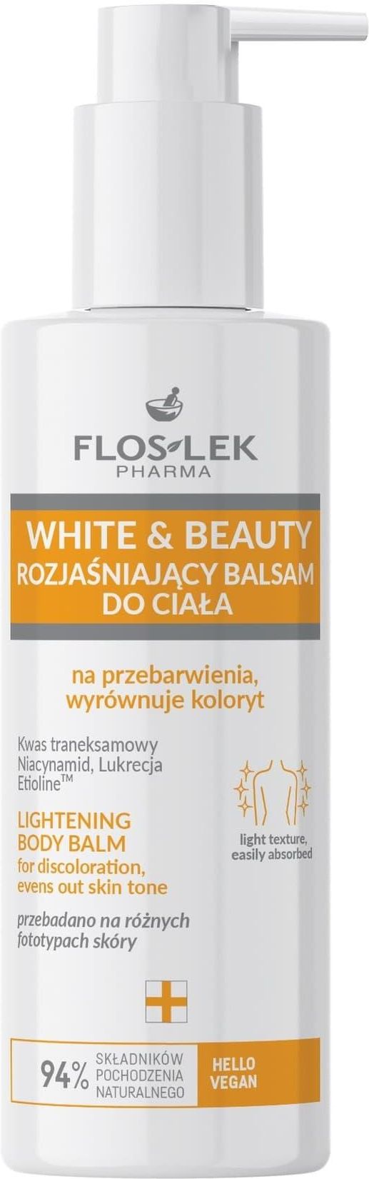 WHITE & BEAUTY Rozjaśniający balsam do ciała 175 ml - Floslek Rozjaśniający balsam do ciała WHITE & BEAUTY na przebarwienia z kwasem traneksamowym, niacynamidem, lukrecją i EtiolineTM wyrównuje koloryt Balsam rozjaśniający skórę do codziennej pielęgnacji ciała z problemem przebarwień, …
