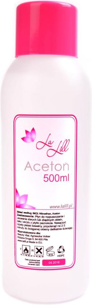 La Lill Czysty Aceton to preparat do usuwania tipsów, ozdób na paznokciach, mas akrylowych i żelowych, warstwy lakieru hybrydowego z płytki paznokcia. To najsilniejszy i najczystszy środek, bez dodatku innych składników. Sposób użycia: Nawilż wacik acetonem, przyłóż do płytki paznokcia, odczekaj 30 sekund lub dłużej w zależności od jakości użytych hybryd, zdejmij wacik mocnym energicznym ruchem, lakier zostanie usunięty. Pojemność: 500 ml