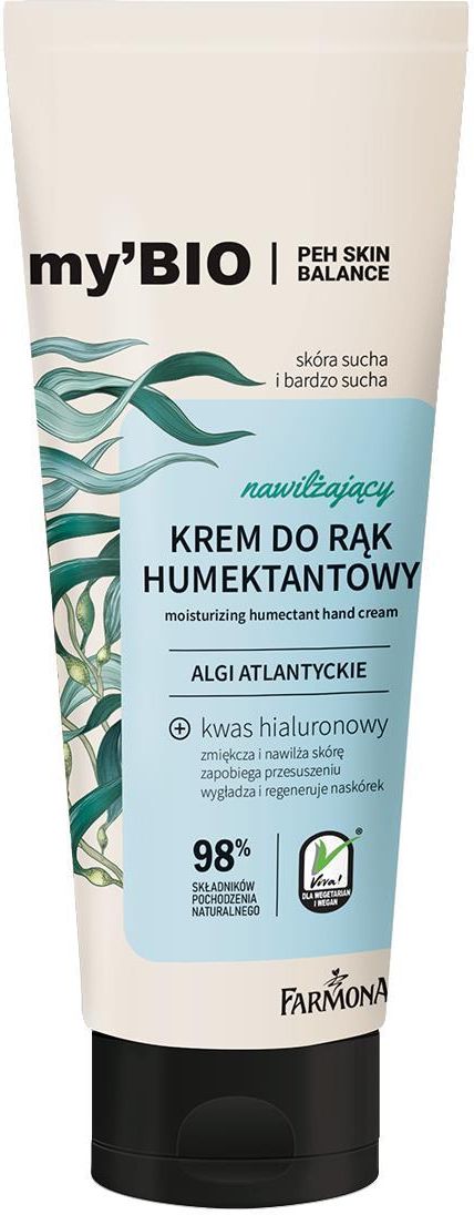 My'Bio Humektantowy Krem do Rąk Nawilżający 100 ml Zalety Konsystencja: lekka, nieobciążająca, Niweluje uczucie przesuszenia i dyskomfortu, Intensywnie nawilża i zmiękcza skórę, Wyraźnie wygładza i regeneruje naskórek. Opis produktu Opracowany zgodnie z filozofią PEH SKIN BALANCE nawilżający krem humektantowy do rąk ma niezwykle lekką, szybko wchłaniającą się formułę. Dzięki połączeniu intensywnie nawilżających humektantów z multifunkcyjnym ekstraktem z alg atlantyckich, krem doskonale nawilża, regeneruje, zmiękcza i wygładza skórę. Co to jest PEH Skin Balance? PEH SKIN BALANCE to świadoma pielęgnacja przywracająca skórze równowagę poprzez odpowiednią proporcje protein, emolientów i humektantów. Wybierz formułę najlepiej dopasowaną do twoich potrzeb: Proteiny = odbudowa Emolienty = odżywienie Humektanty = nawilżenie Składniki aktywne ekstrakt z alg atlantyckich wosk z borówki Efekty: skóra intensywnie zregenerowana i nawilżona, widocznie wygładzony naskórek, zredukowana suchość. Humektanty: kwas hialuronowy, Hydromanil, Hydrafeel-3. Przeznaczenie: skóra sucha i bardzo sucha. 98% składników pochodzenia naturalnego! Sposób użycia Delikatnie wmasuj w skórę rąk. Skład Aqua (Water), Prunus Amygdalus Dulcis (Sweet Almond) Oil, Olea Europaea (Olive) Fruit Oil, Glycerin, Butyrospermum Parkii (Shea) Butter, Cetearyl Alcohol, Pentaerythrityl Distearate, Isostearyl Isostearate, Glyceryl Stearate, Polyglyceryl-3 PCA, Hydrolyzed Caesalpinia Spinosa Gum, Caesalpinia Spinosa Gum, Sodium Hyaluronate, Spirulina Platensis Extract, Rhus Verniciflua Peel Cera/Rhus Succedanea Fruit Cera, Tocopheryl Acetate, Sodium Stearoyl Glutamate, Lactic Acid, Xanthan Gum, Potassium Sorbate, Sodium Phytate, Phenoxyethanol, Ethylhexylglycerin, Octenidine HCl, Parfum (Fragrance), Benzyl Salicylate, Citronellol, Coumarin, Hexyl Cinnamal, Limonene, Linalool, Alpha-Isomethyl Ionone. EAN: 5900117981009 Firma FARMONA to polska marka kosmetyków istniejąca od 1997 roku. Łączy najnowsze zdobycze kosmetologii oraz odżywczą moc naturalnych składników roślinnych. Obecna oferta Laboratorium Kosmetyków Naturalnych Farmona obejmuje ponad 450 kosmetykówdo pielęgnacji ciała, twarzy i włosów. Misją firmy FARMONA jest wytwarzanie wysokiej jakości wyrobów kosmetycznych spełniających wymagania użytkowe i estetyczne przy zastosowaniu technologii bezpiecznych dla środowiska. Dzięki posiadaniu własnego laboratorium badawczo-rozwojowego, prowadzeniu badań i monitorowaniu rynkowych trendów, firma nieustannie poszukuje nowych formuł i składników aktywnych, które zaspokoją potrzeby nawet najbardziej wymagających Klientów. Podstawą wszystkich produktów Laboratorium Kosmetyków Naturalnych Farmona są naturalne składniki aktywne, standaryzowane ekstrakty o wysokim stopniu czystości ekologicznej – w optymalnych stężeniach dla zapewnienia skuteczności i bezpieczeństwa stosowania.