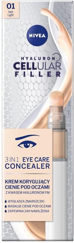 Nivea Celluar 3w1 Krem Korygujący Cienie pod Oczami 01 Light 4ml Krem korygujące cienie w okolicy pod oczami. Kosmetyk wzbogacony został kwasem hialuronowym. Wygładza drobne zmarszczki, maskuje cienie pod oczami, zapewnia 24h nawilżenia. Pozostawia naturalnie wyglądający, rozświetlający efekt na skórze. Kosmetyk występuje w kilku wersjach kolorystycznych. Odcień: 01 Light Pojemność: 4ml