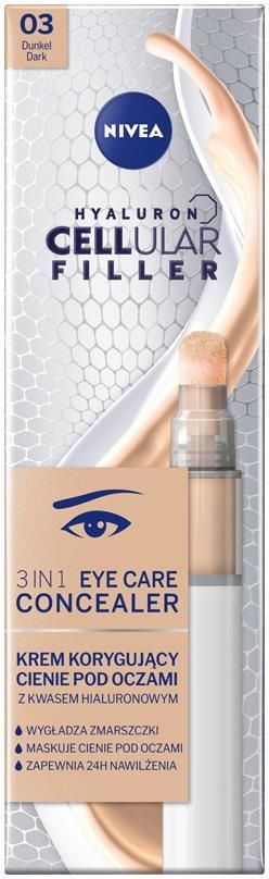 Nivea Celluar 3w1 Krem Korygujący Cienie pod Oczami 03 Dark 4ml Krem korygujące cienie w okolicy pod oczami. Kosmetyk wzbogacony został kwasem hialuronowym. Wygładza drobne zmarszczki, maskuje cienie pod oczami, zapewnia 24h nawilżenia. Pozostawia naturalnie wyglądający, rozświetlający efekt na skórze. Kosmetyk występuje w kilku wersjach kolorystycznych. Odcień: 03 Dark Pojemność: 4ml