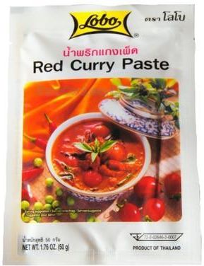 Tajska Czerwona Pasta Curry "Red Curry Paste" 50g Lobo Waga netto: 50g Skład: czerwone chilli, trawa cytrynowa, czosnek, sól, szalotki, pasta krewetkowa (krewetki, sól), skórka z limonki kaffir, kmin w proszku. Może zawierać śladowe ilości ryb. Wartość odżywcza / 100g: wartość energetyczna 501kJ/120 kcal, tłuszcze 1,1g (w tym kwasy tłuszczowe nasycone 0g), węglowodany 18g (w tym cukry 2,4g), białko 3,9g, sól 12,1g.