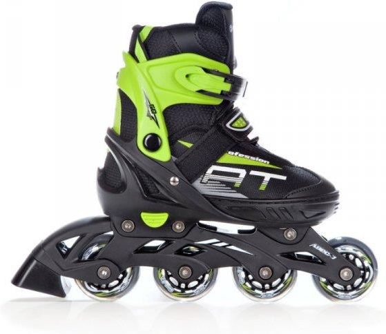 Rolki Wrotki Łyżwy 4w1 RAVEN Profession Black/Green 28-32 (rozmiar regulowany 18,5cm - 21cm) Marka: RAVEN Model: Profession Rozmiar regulowany: 28-32 Rozmiar w centymetrach: 18,5cm - 21cm Łożyska: Abec7 Rozmiar kółek: 64mm Twardość kółek: PU - kauczukowe 82A Płoza rolkowa: Kompozytowa Płoza łyżwowa: Figurowa, kompozytowo-stalowa Bardzo lekka i wytrzymała półmiękka skorupa z poliwęglanu Trzystopniowe zapięcie - klamra, sznurowadła, pasek Double foam - podwójna pianka wyściełająca wnętrze buta Bardzo efektywny hamulec Łożyska ABEC-7 Kółka kauczukowe - 64mm - 82A Płoza kompozytowa - bardzo lekka i wytrzymała Double Vent-System - system wentylacji DSAS - Double-Shock-Absorbing-System - podwójny system pochłaniający drgania Hamulec jest tylko przy prawym bucie, tak jak u wszystkich producentów rolek. Hamulec można przełożyć do lewego buta. Rolki posiadają regulowany rozmiar w zakresie podanym w ofercie W zestawie znajdują się się fabrycznie naostrzone płozy łyżwowe, klucze, śruby oraz dłuższe osie umożliwiające odkręcenie kółek i zamontowanie ich po obu stronach płozy rolkowej celem uzyskania pożądanej konfiguracji. Przełożenie kół nie wymaga wiedzy technicznej, jest przystępnie pokazane w dołączonej instrukcji obsługi i nie wymaga odkręcania płozy rolkowej. Rolki regulowane Rozmiar rolki regulujemy poprzez naciśnięcie przycisku mechanizmu regulacji i wysunięciu przedniej części skorupy buta.