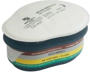 Zestaw filtrów 3055 ABEK1 P3 R (pochłaniacz 3025 ABEK1 + filtr SECAIR 3000.03 P3 R) po skompletowaniu z półmaską lub maską chroni układ oddechowy przed gazami i parami substancji organicznych i nieorganicznych, parami i gazami kwaśnymi, amoniakiem i jego pochodnymi organicznymi, a także mieszaninami w/w substancji oraz pyłami, dymami i mgłami. Dopuszczalne stężenie par i gazów wynosi 0.1% obj. a stężenie fazy rozproszonej aerozolu do 20 x NDS. Najczęściej spotykane substancje, przed którymi chronią pochłaniacze 3025 ABEK1: Substancje z grupy A: aldehydy, alkohole, benzen, benzyna, bezwodnik octowy, bromek: etylu, metylu; chlorki: allilu, butylu, etylenu, izopropylu, winylu; chlorobenzen, chloroform, cykloheksan, cykloheksanol, cykloheksanon, cykloheksen, czterochlorek węgla, czterochloroetan, czterochloroetylen, dioksan, dwubromoetan, dwuchlorobenzen, dwuchloroetylen, dwuchloronitroetan, dwuchloropropan, dwuetyloketon, dwupropyloketon, epichlorohydryna, estry, etery, etylobenzen, freon, heptan, glikol metylowy, kamfora, ksylen, kwas octowy, lizol, merkaptany, metylobutyloketon, mocznik, nafta, naftalen, nikotyna, nitrobenzen, nitrogliceryna, nitropropan, nitrotoluen, octan amylu, octan etylu, octan winylu, ozon, styren, terpentyna, tetralina, tetrahydrofuran, tiofen, tlenek mezytylu, toluen, trójchlorometan, trójchloroetylen oraz opary asfaltu, smoły, pokostu i inne. Substancje z grupy B: arsenowodór, brom, bromowodór, chlor, dwusiarczek węgla, fluor, formaldehyd, fosforowodór, jod, jodowodór, kwas mrówkowy, siarkowodór. Substancje z grupy E: chlor, chlorowodór, dwutlenek azotu, dwutlenek siarki, kwas mrówkowy, siarkowodór, trójtlenek siarki. Substancje z grupy K: amoniak i jego pochodne organiczne (aminy: metyloamina, dwumetyloamina, dwumetyloetyloamina, etyloamina, iminodwuetyloamina), anilina. Najczęściej spotykane substancje, przed którymi chronią filtry SECAIR 3000.03 P3 R: Antymon i jego związki, azbest, bar i jego związki, bawełna, bezwodnik ftalowy, celuloza, chrom i jego związki, cyjanamid, cyna i jej związki, dwutlenek krzemu, dymy spawalnicze, fosfor, ftalan dwubutylu, glin i jego związki, grafit, hydrochinon, kadm i jego związki, kobalt i jego związki, kwarc (pył respirabilny), kwas fosforowy, mangan i jego związki, miedź i jej związki, nikiel, nitroanilina, oleje mineralne (mgła i dym), pyły drewna (za wyjątkiem drewna twardego), selen i jego związki, talk, tlenek magnezu (dym), tlenek żelaza (dym), trójnitrotoluen, tytan i jego związki, węgiel, wodorotlenek sodu, wolfram i jego związki, związki wapnia. Zestaw filtrów (pochłaniacz 3025 ABEK1 oraz filtr SECAIR 3000.03 P3 R) może być stosowany z następującymi częściami twarzowymi: - półmaski serii SECURA 2000 lub serii SECURA 3000 (3000, 3100, 3200) - pełne maski z łączem identycznym z łączem SECURA Zestaw filtrów pakowany jest po 2 sztuki pochłaniaczy 3025 ABEK1 oraz 2 sztuki filtrów SECAIR 3000.03 P3 R. NORMY I CERTYFIKATY EN 143 EN 14387