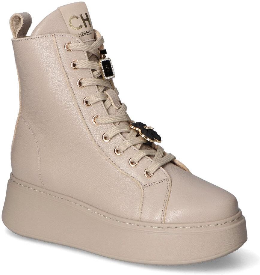 Wyjątkowe botki znanej marki CheBello:- cholewka wykonana została ze skóry naturalnej licowej - wnętrze pokryte zostało materiałem ocieplającym - ocieplana wkładka zapewnia ciepło podczas użytkowania w chłodne dni - sznurowadła i zamek błyskawiczny ułatwiają zakładanie i dopasowanie obuwia - podeszwa o grubości 6 cm zapewnia odpowiednią stabilizację - beżowy kolor oraz modny fason tworzą idealne połączenie!