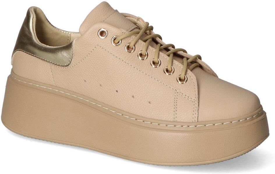 Eleganckie sneakersy firmy Kamex-but: - cholewka wykonana została ze skóry naturalnej licowej - wnętrze zostało pokryte skórą naturalną aby zapewnić komfort podczas użytkowania - wkładka wewnętrzna została wykonana ze skóry naturalnej - podeszwa o wys. 5 cm zapewnia odpowiednia stabilizację - ciemny odcień beżu i modny fason tworzą idealne połączenie, które zachwyci każdego!